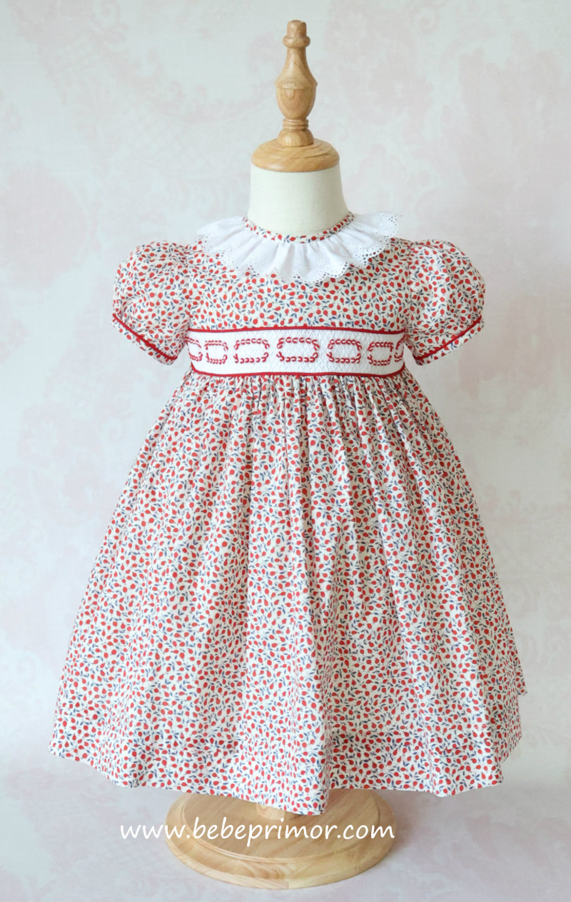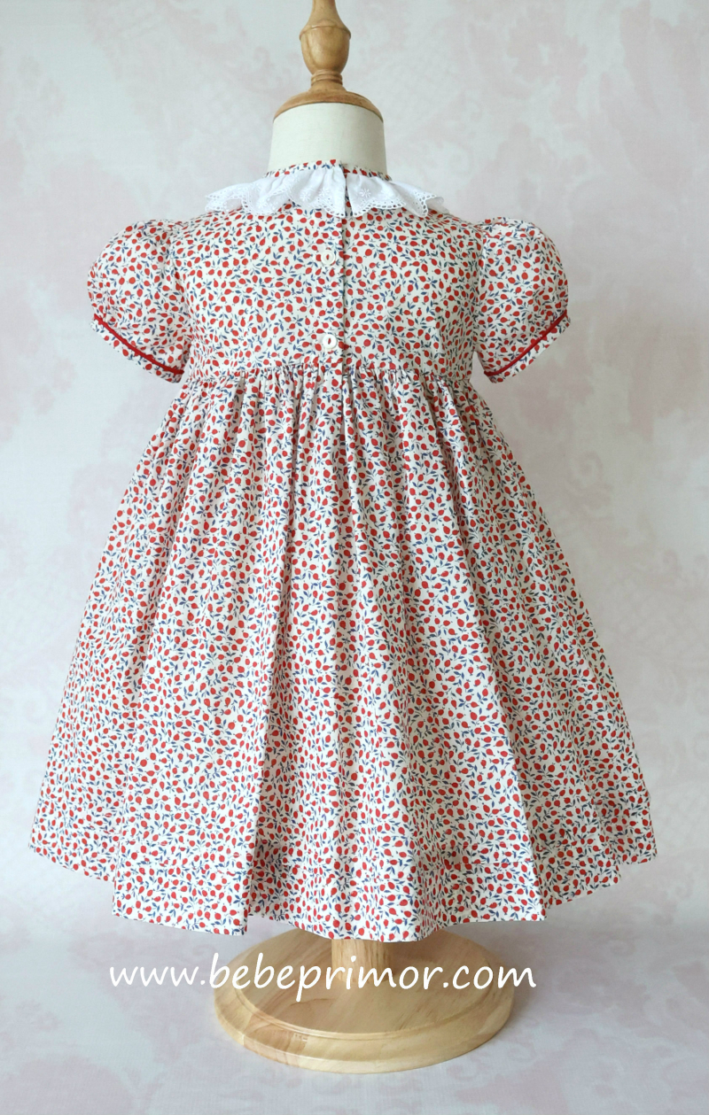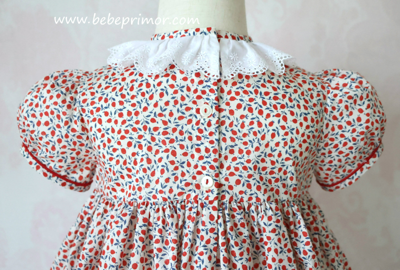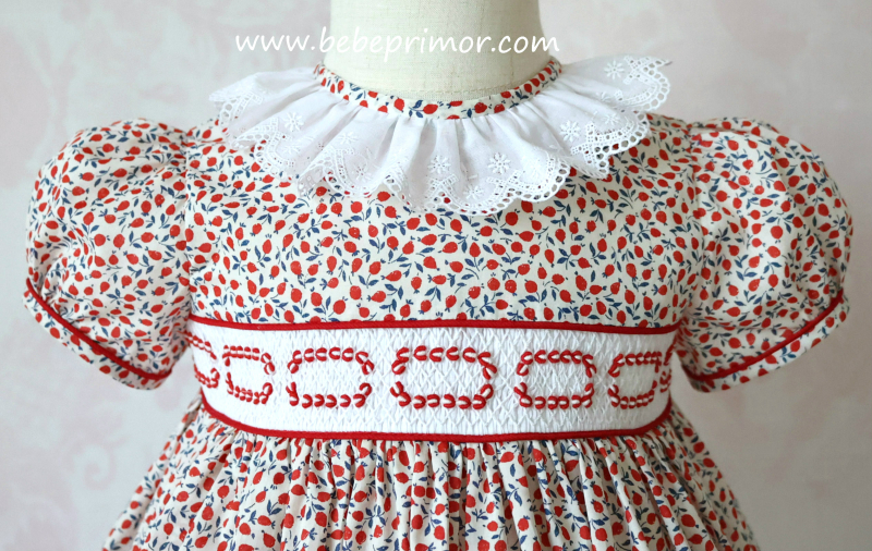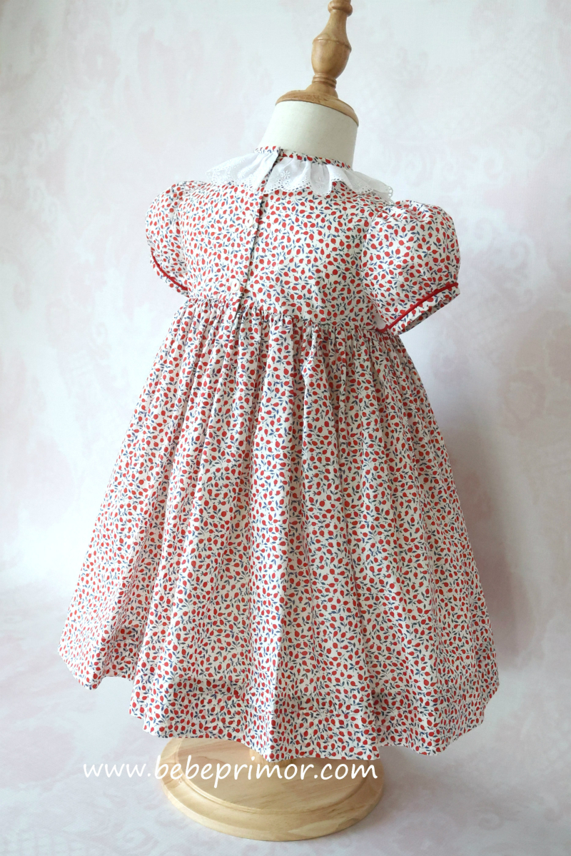 ¡Elegancia instantánea! Confeccionada con una hermosa tela Liberty, esta pieza mantendrá a tu niña elegante y cómoda al mismo tiempo. Simplista pero refinado, este vestido presenta volante en el cuello ,tiras bordadas suiza y botones en madre perlas.El fruncido o panal bordado a mano de la cintura en nelona suiza se suma a esta silueta relajada,perfecto para cumpleaños o una ocación especial.