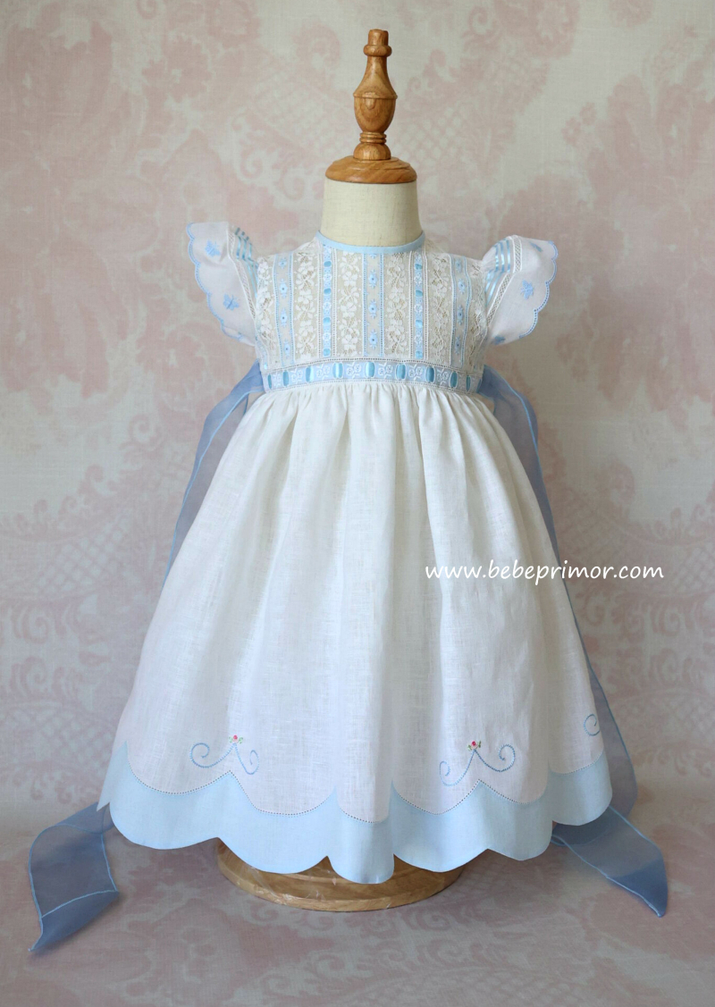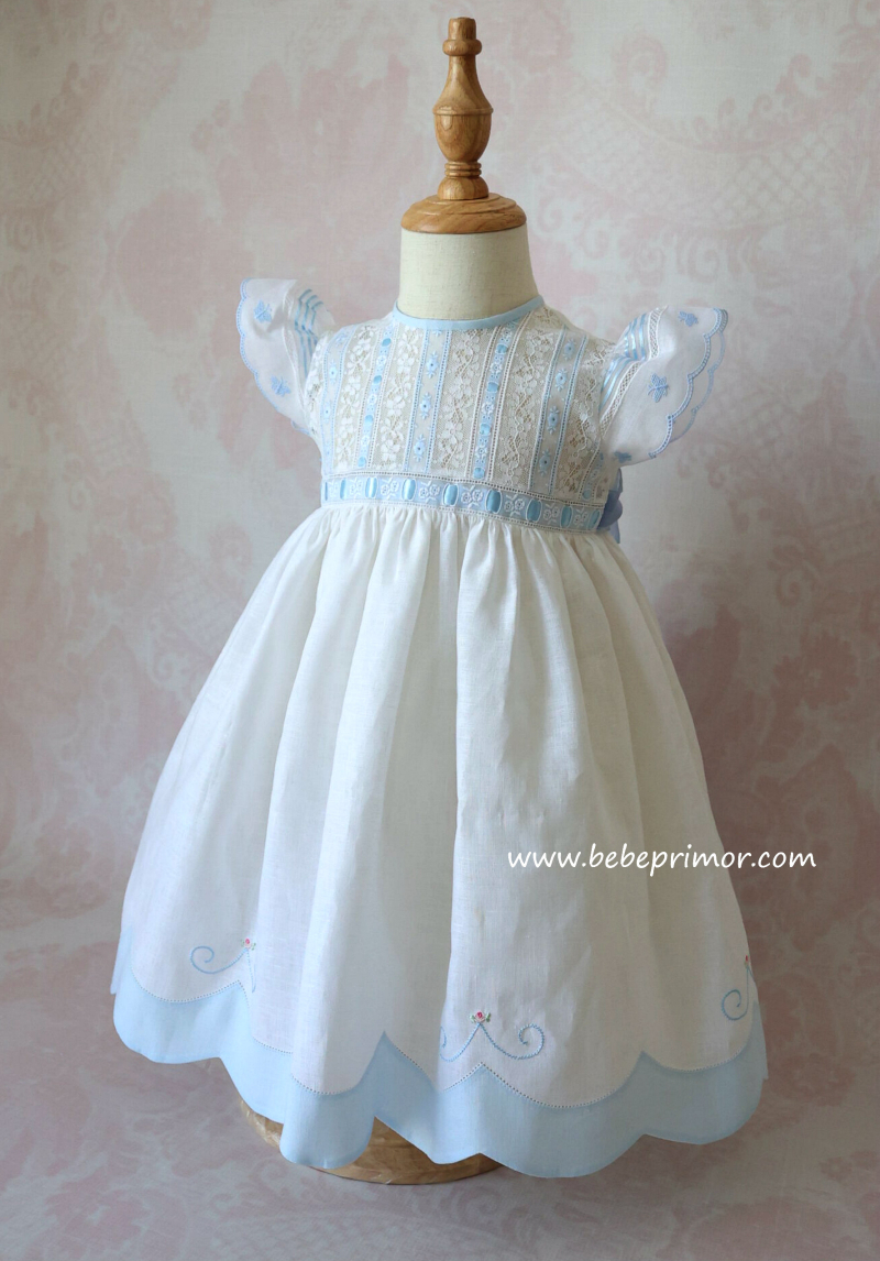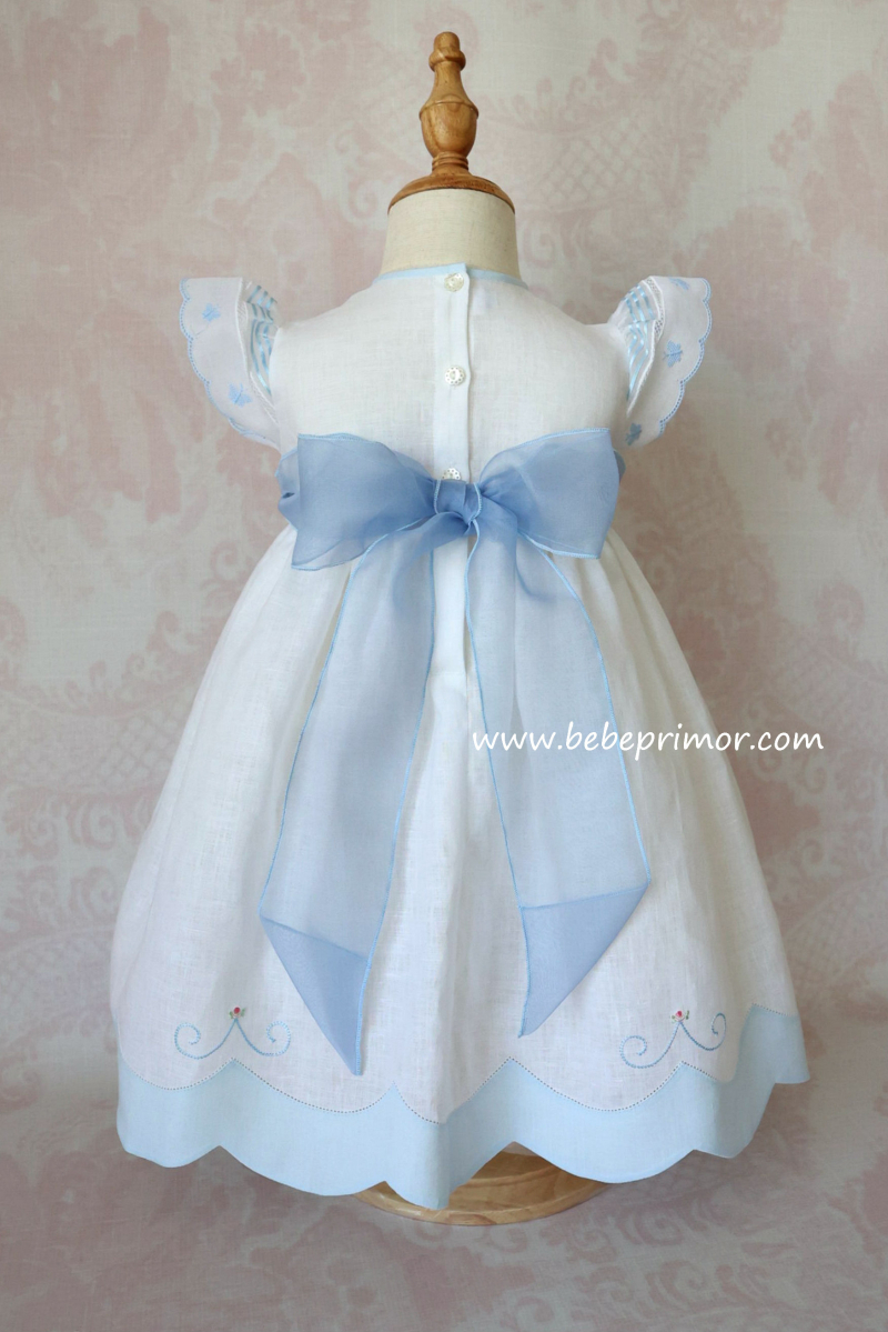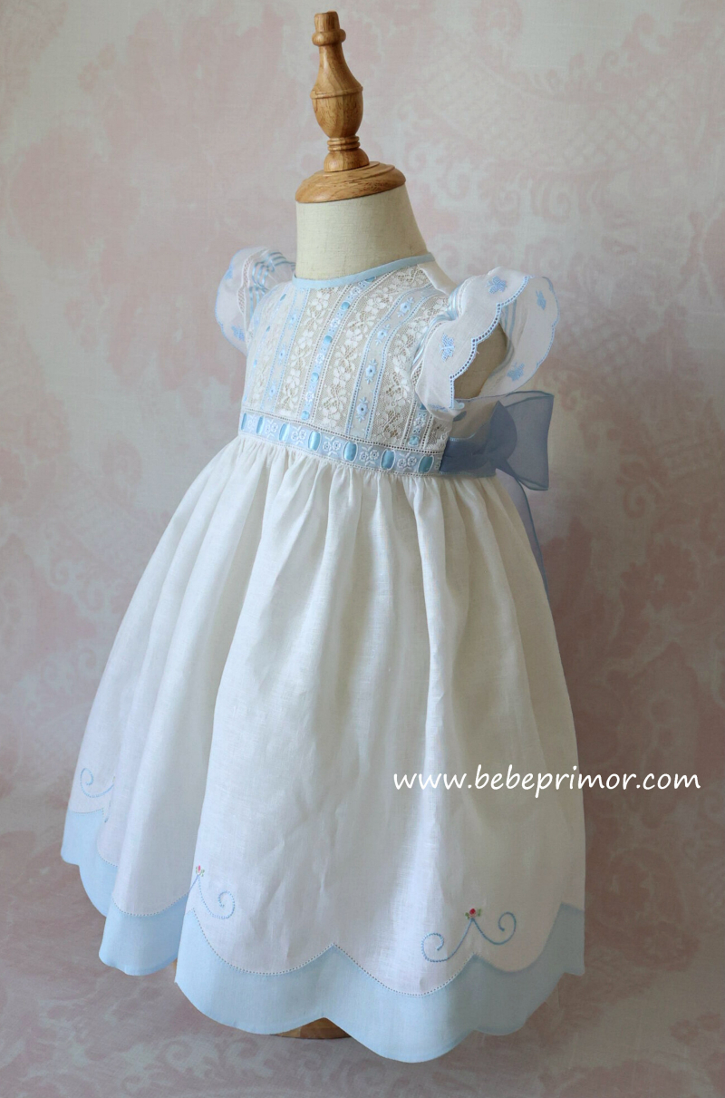 Encantador vestido, perfecto para lucir el día del cumpleaño, confeccionado en estopilla, lino 100% original blanco y azul cielo, bordado, ruedo en appliqué en madera, cuenta con volantes en las mangas y una elegante pechera en tiras bordadas suiza y valenciennes, cintas en satín, botones en madre perla, ata detrás con una banda en organza de seda para una silueta de lujo.