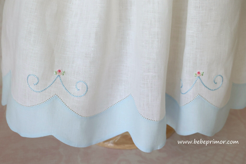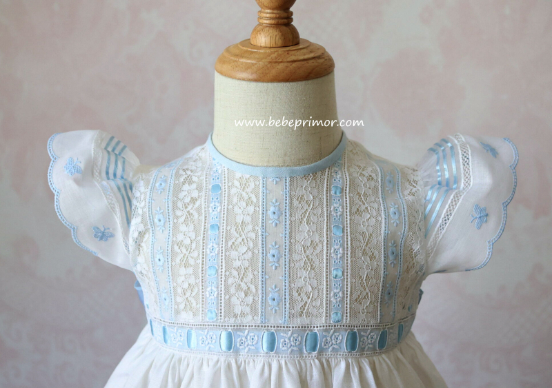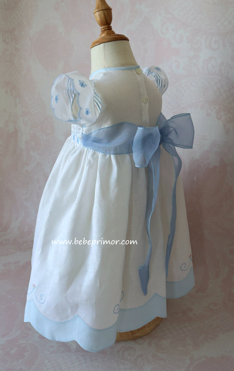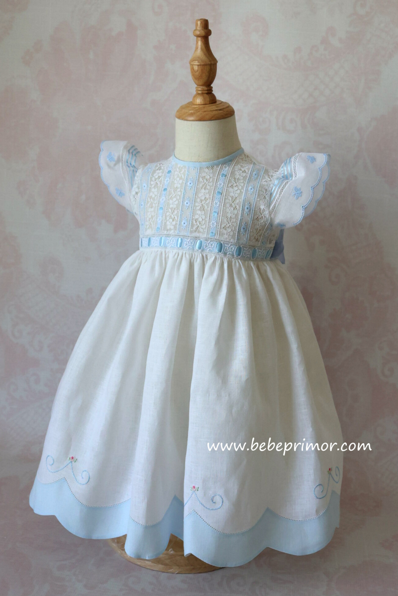 Encantador vestido, perfecto para lucir el día del cumpleaño, confeccionado en estopilla, lino 100% original blanco y azul cielo, bordado, ruedo en appliqué en madera, cuenta con volantes en las mangas y una elegante pechera en tiras bordadas suiza y valenciennes, cintas en satín, botones en madre perla, ata detrás con una banda en organza de seda para una silueta de lujo.