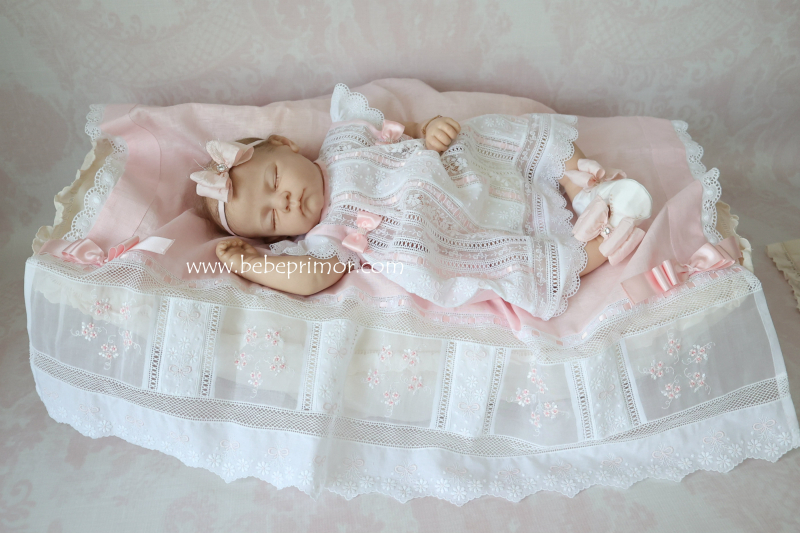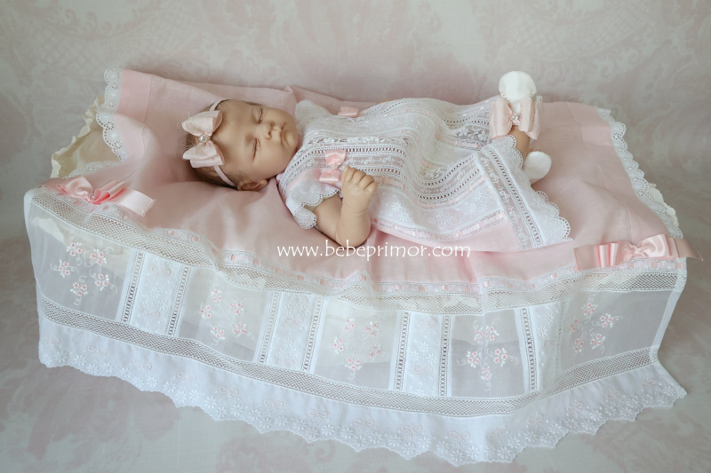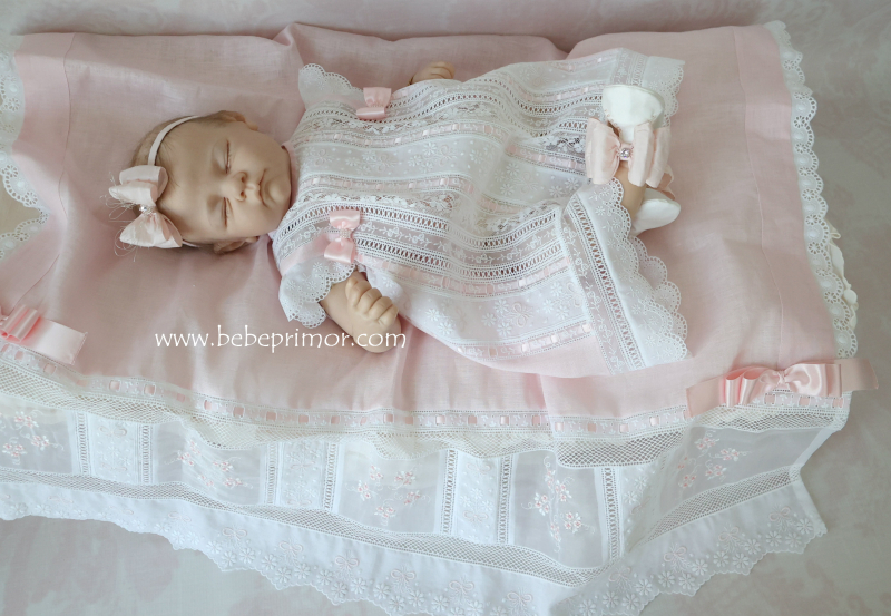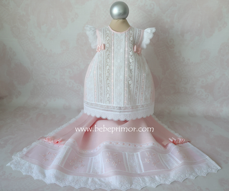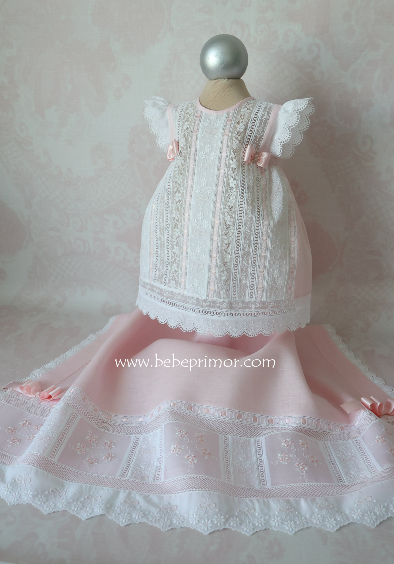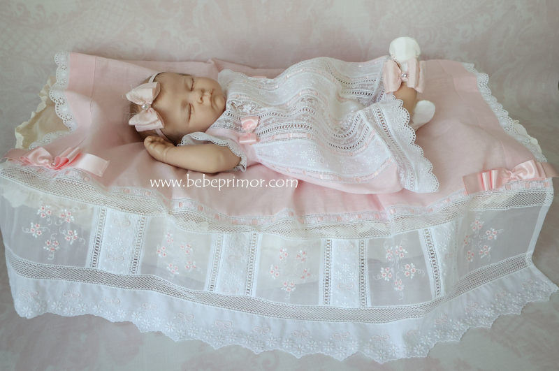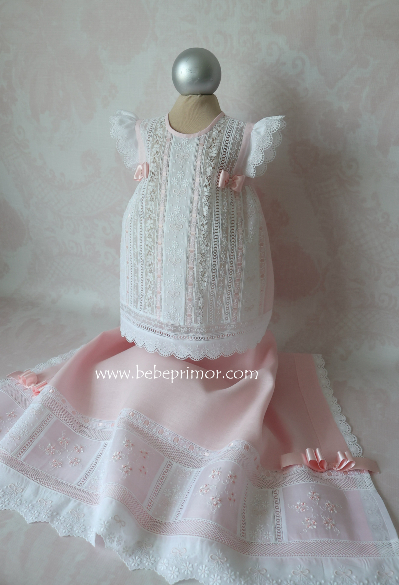 Llévala a pasear con éste precioso juego para cualquier ocación especial de dos piezas vestidito y sabanita en estopilla rosita con aplicaciones bordadas en organdí suizo,tiras bordadas suiza,pasacintas y valencién francés.