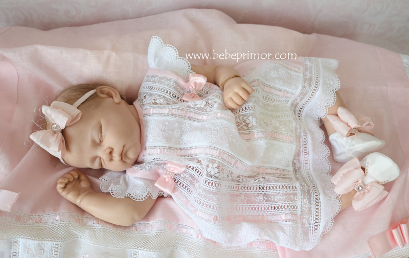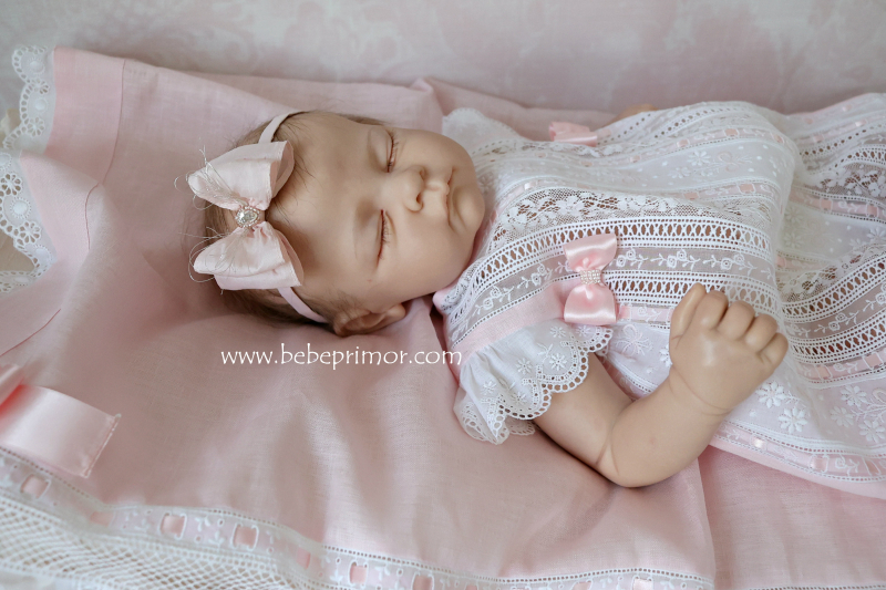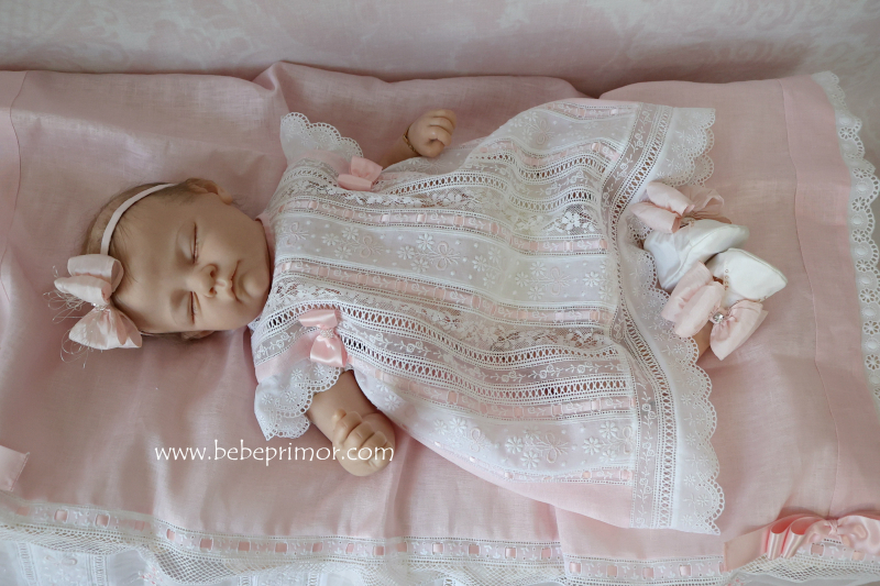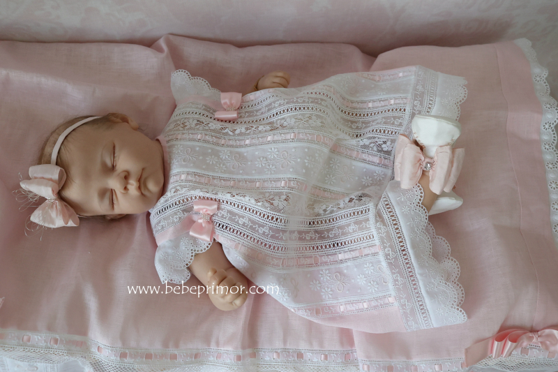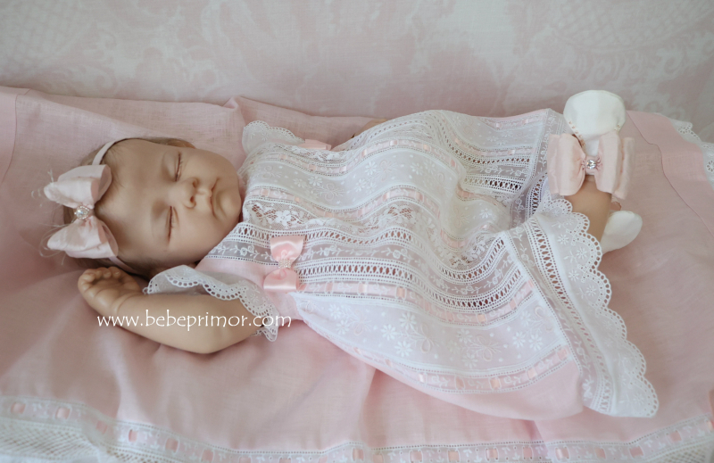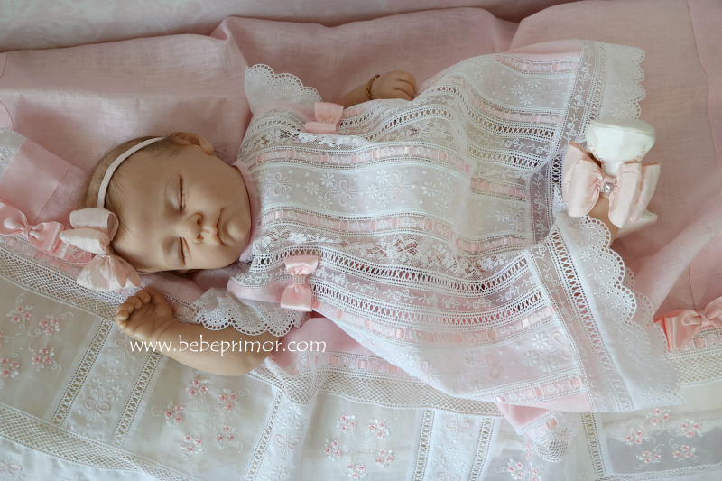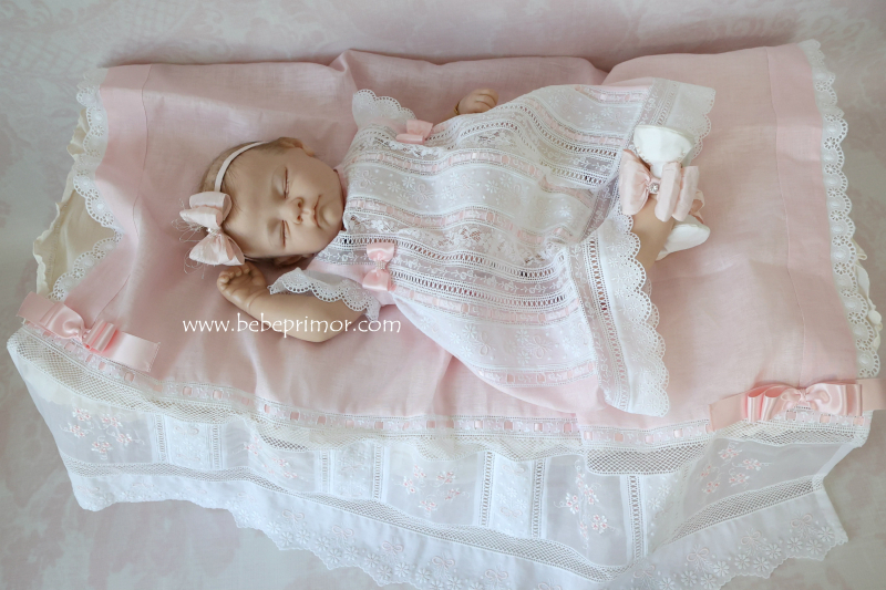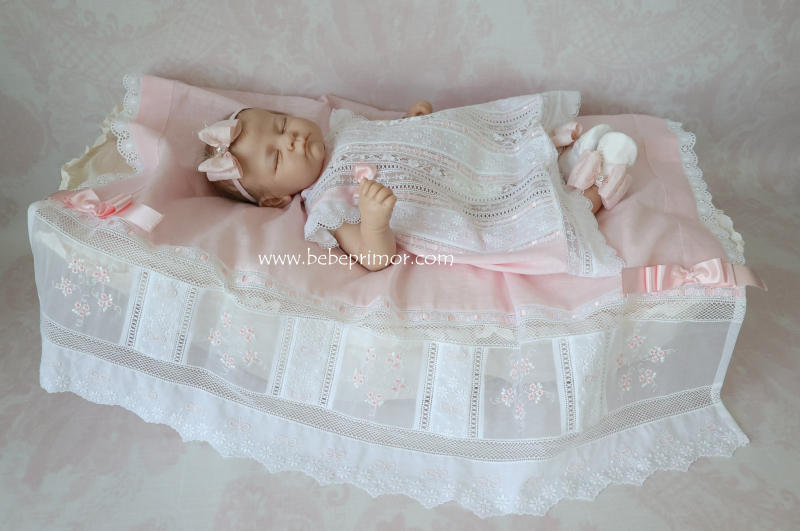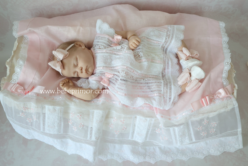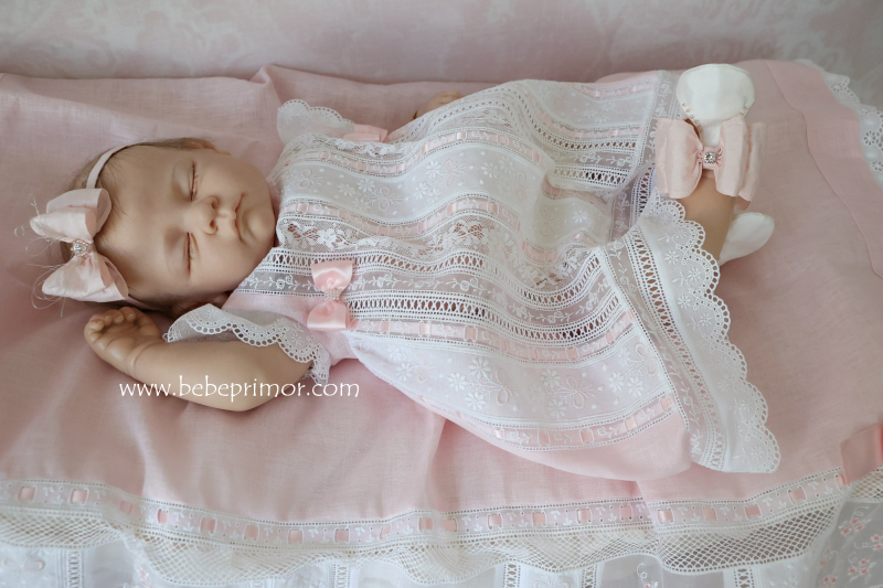 Llévala a pasear con éste precioso juego para cualquier ocación especial de dos piezas vestidito y sabanita en estopilla rosita con aplicaciones bordadas en organdí suizo,tiras bordadas suiza,pasacintas y valencién francés.