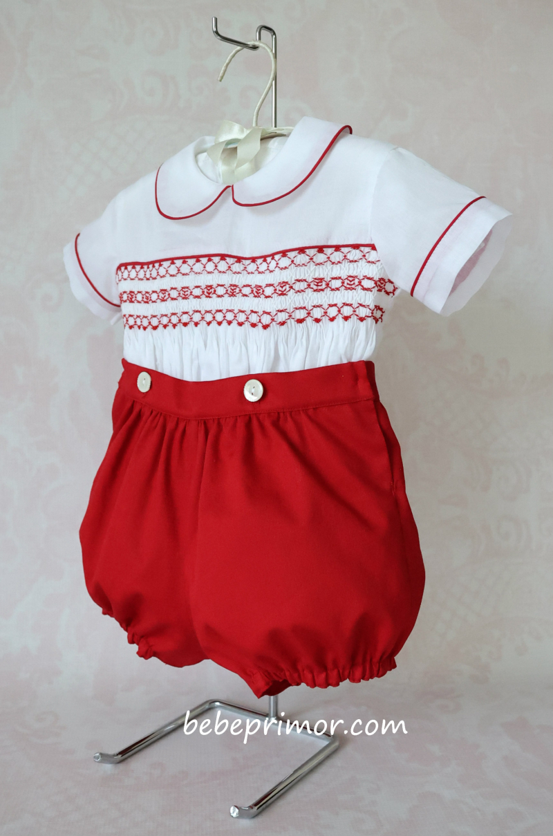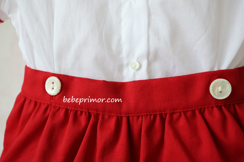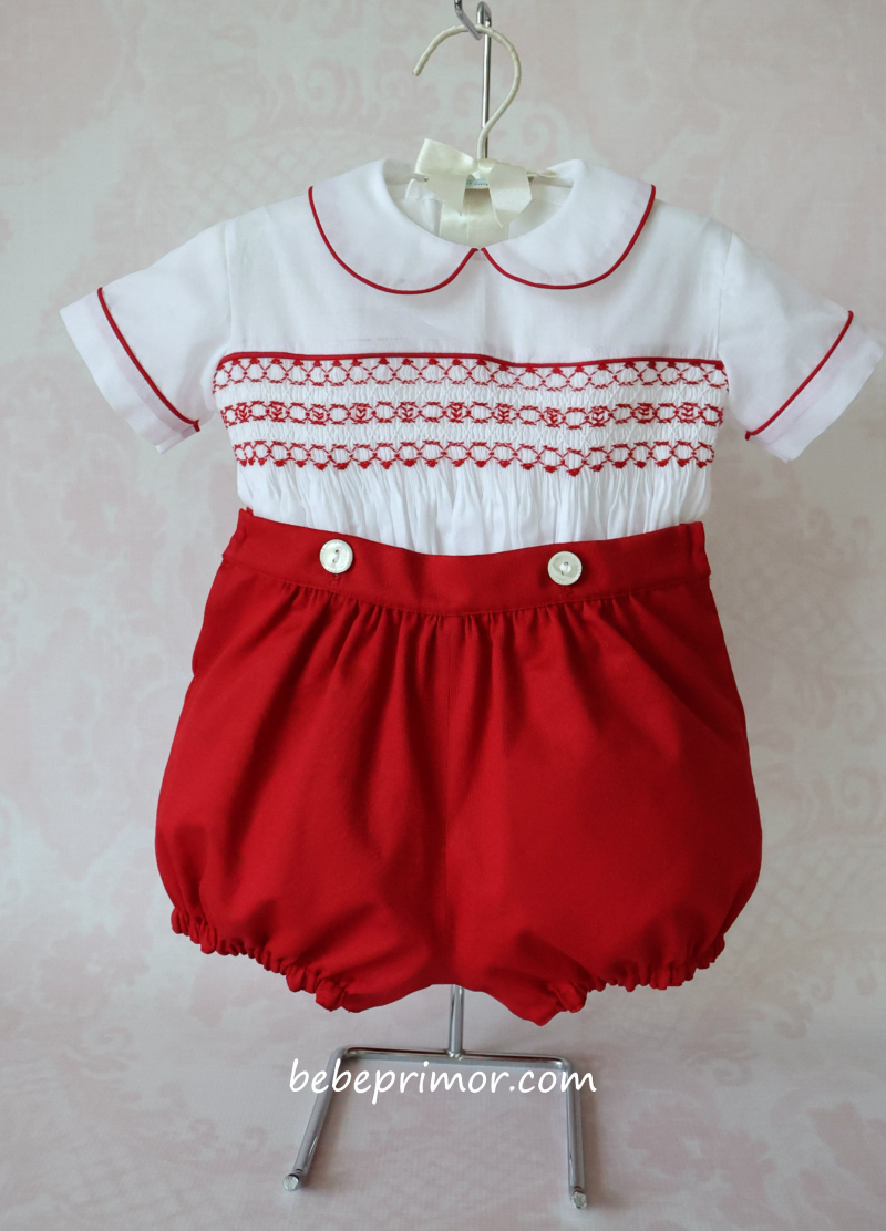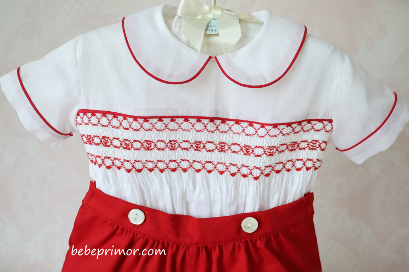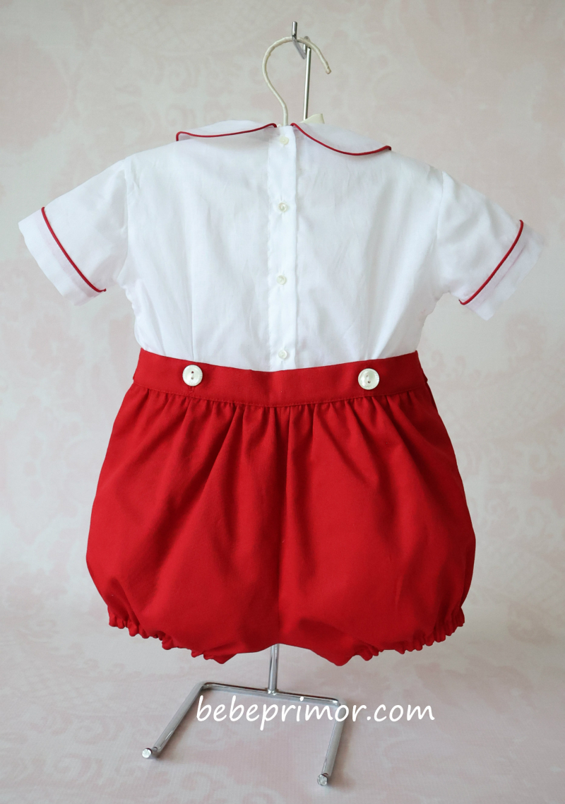 ¡Nuestro juego Antonio presenta un aspecto elegante y con estilo! Confeccionado en suave nelona suiza de algodón blanco con ribetes rojos en contraste en las mangas, el cuello y la parte delantera, con bordado fruncido a mano en el pecho con un diseño de inspiración vintage. Esta pieza se abrocha con delicados botones de nácar en la faja del short y detrás de la camisa, lo que agrega un toque especial para mantener a tu pequeño con estilo y cómodo ,va combinado con short en piqué suizo rojo.