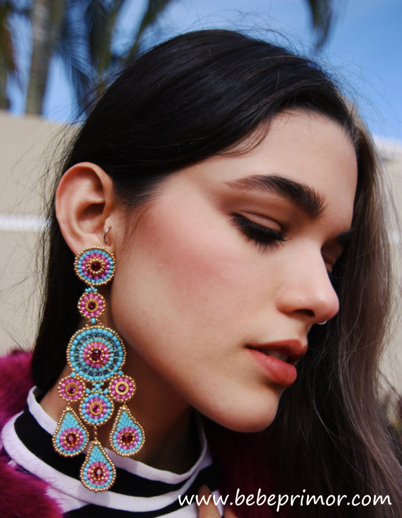 Aretes hermoso con cuentas por todas partes,trio de colgante de lágrimas suspendidos con medallones redondos,éstos pendientes hechos a mano,cuentas miyuki,14K gold filled y cristales swarovski,en tonos azul turquesa y magenta ,largo aproximadamente 10,5 cm ,ancho 4,2cmm