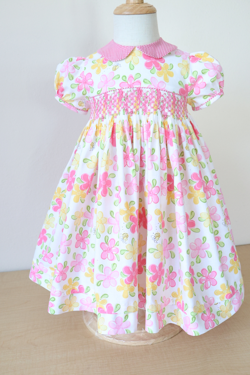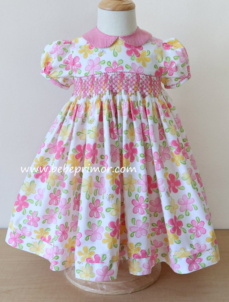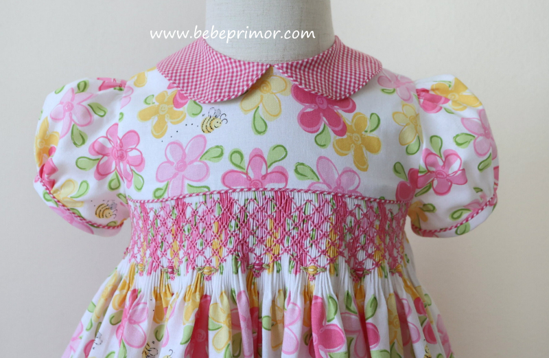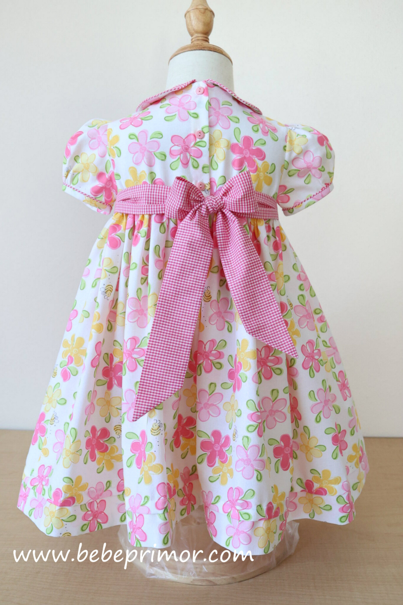 Presentamos el vestido floral rosa, un ejemplo exquisito de nuestro estilo característico de Bebé Primor. Confeccionado con nuestra tela 100% algodón,este vestido presenta un exquisito fruncido hecho a mano con capullos en rosa bordados en la parte delantera,caprichoso cuello Piter Pan y mangas abullonadas, el vestido seguramente creará un look deslumbrante para tu pequeña.