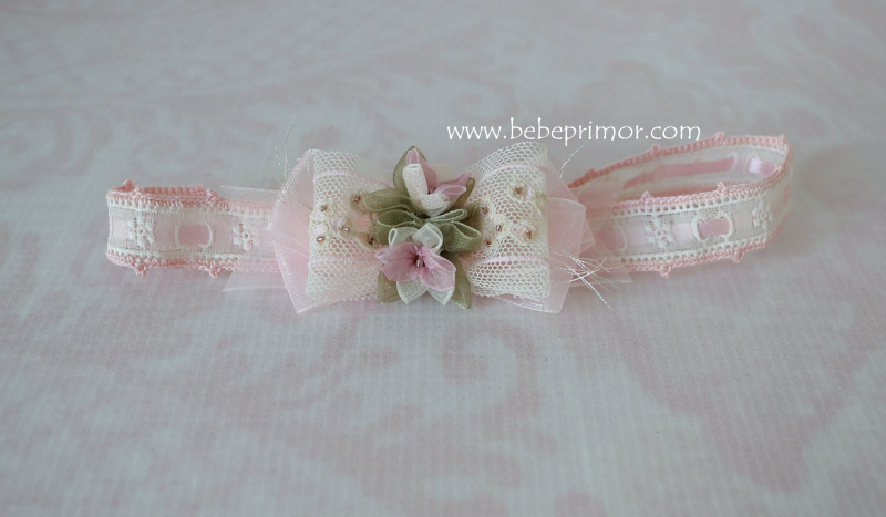 Diadema crema y rosita en pasacinta con detalles tejidos en crochet,perlas Miyuki cosidas a mano.