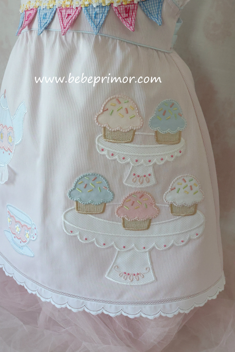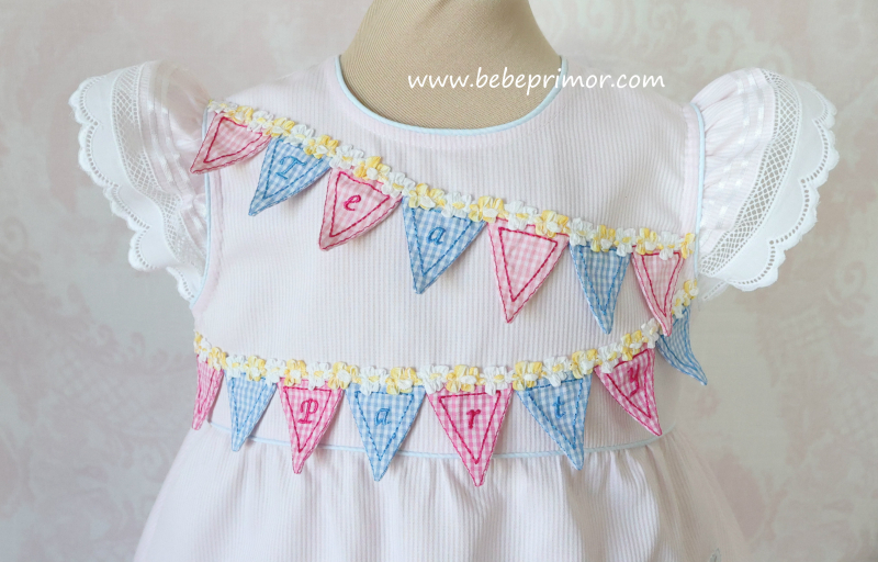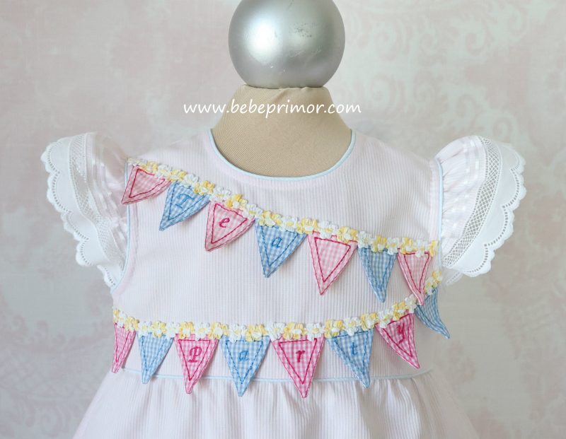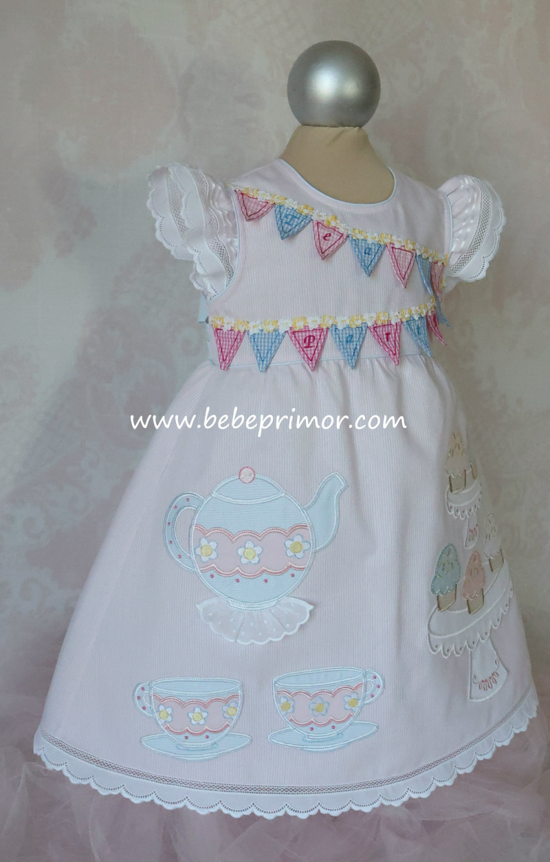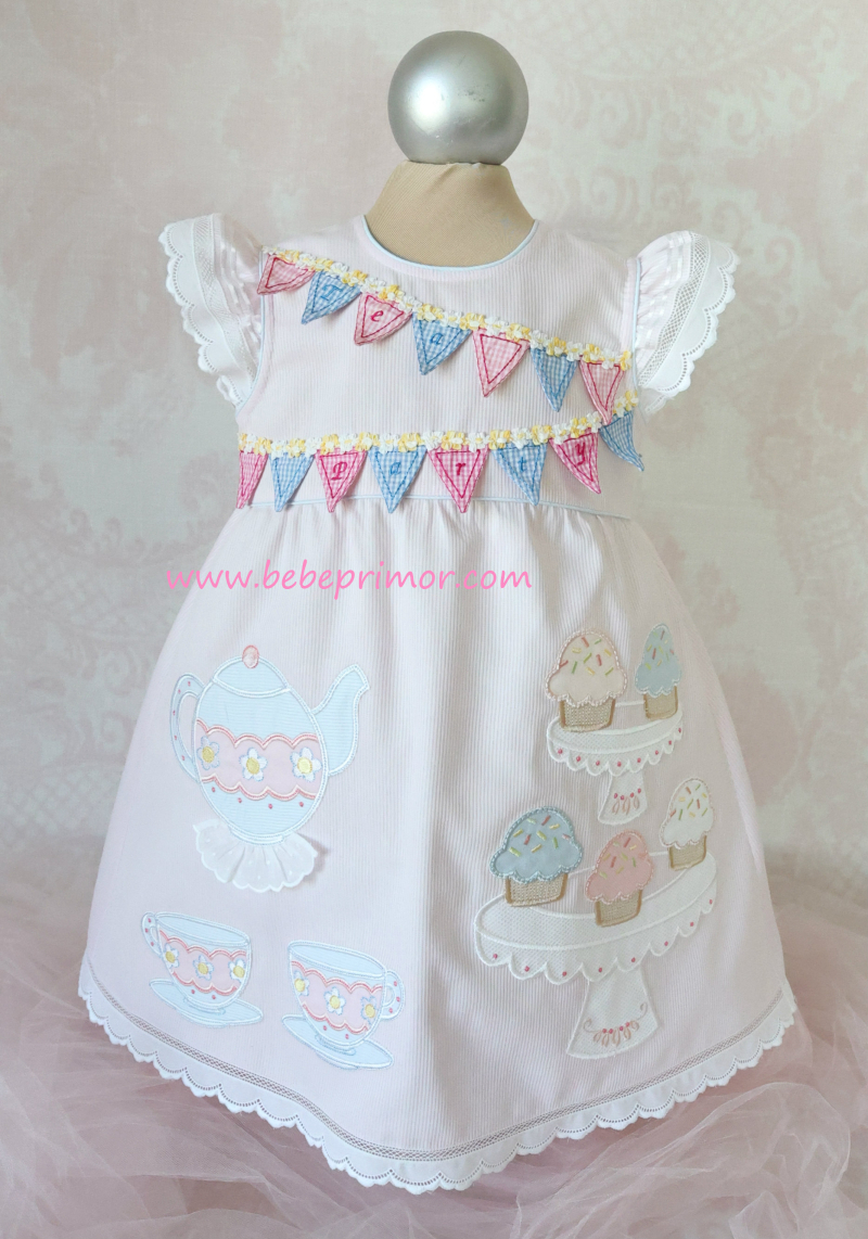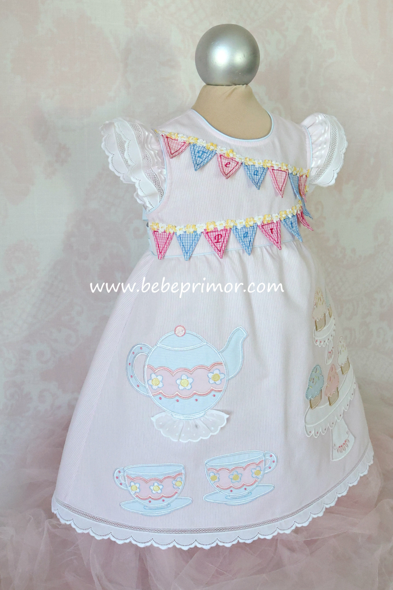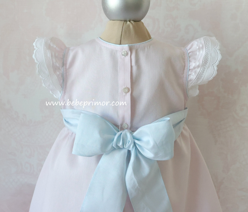 Hermoso vestido de "Fiesta de Té" confeccionado con tiras bordadas suiza,piqué 100% algodón con acabado satinado, raya sombreada color rosa bebé y botones en madre perlas.