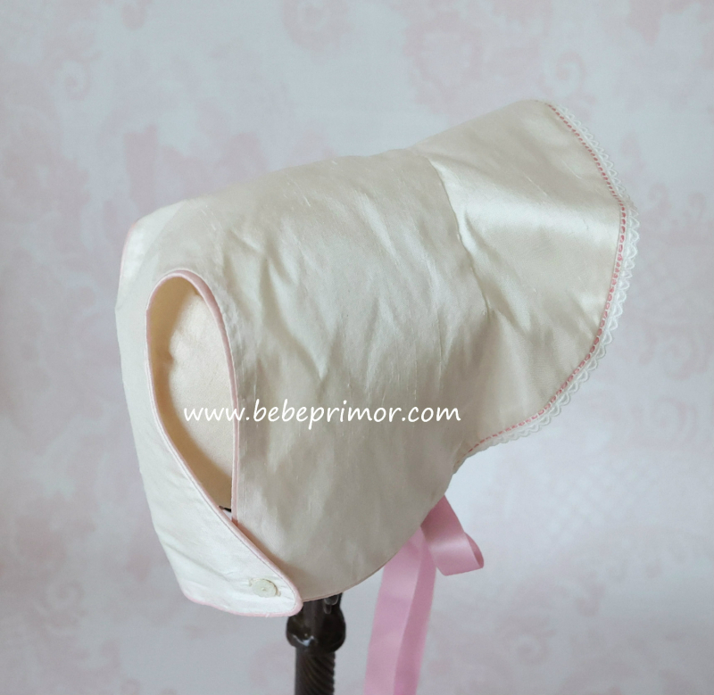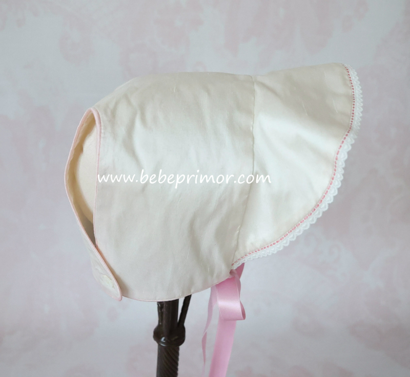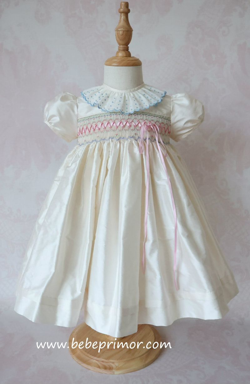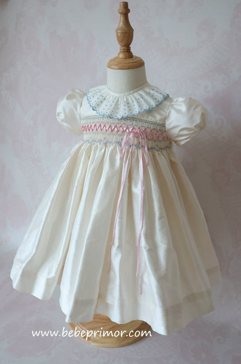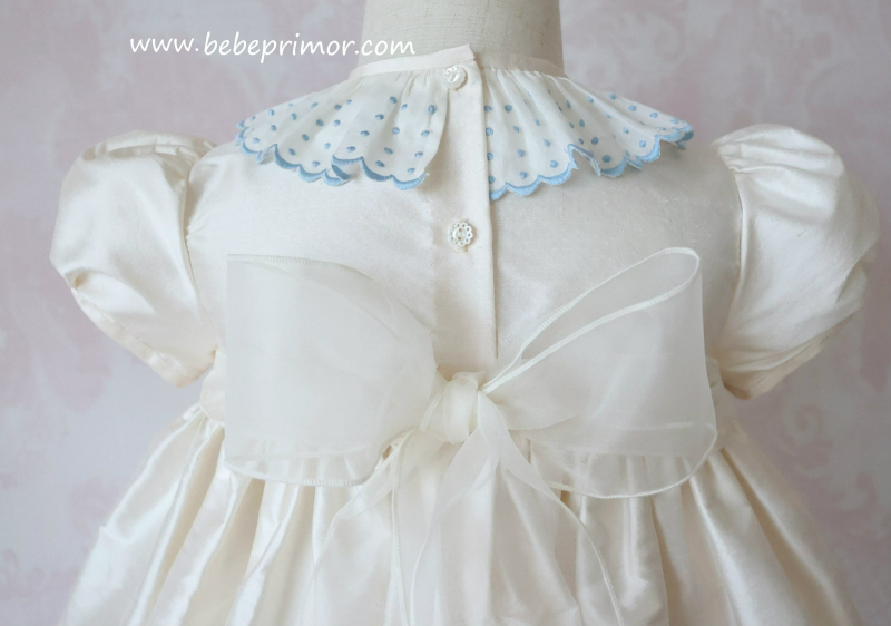 Este hermoso vestido para un dia inolvidable,presenta un exquisito frunce bordado mano estilo vintage con colores pasteles en la línea de la cintura, un hermoso cuello con volantes, se ata en la espalda con una banda en organza de seda y abrocha con delicados botones de nácar, tiene una encantadora cinta de seda entrelazada, que le da un toque femenino extra a esta silueta de lujo, va a juego con un gorrito ,confeccionado en seda cruda color marfil.