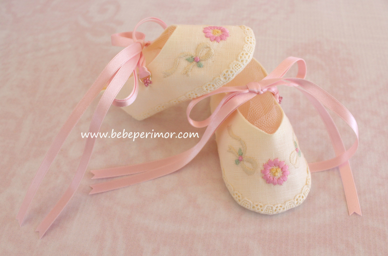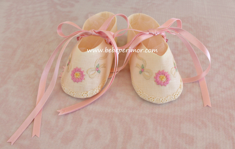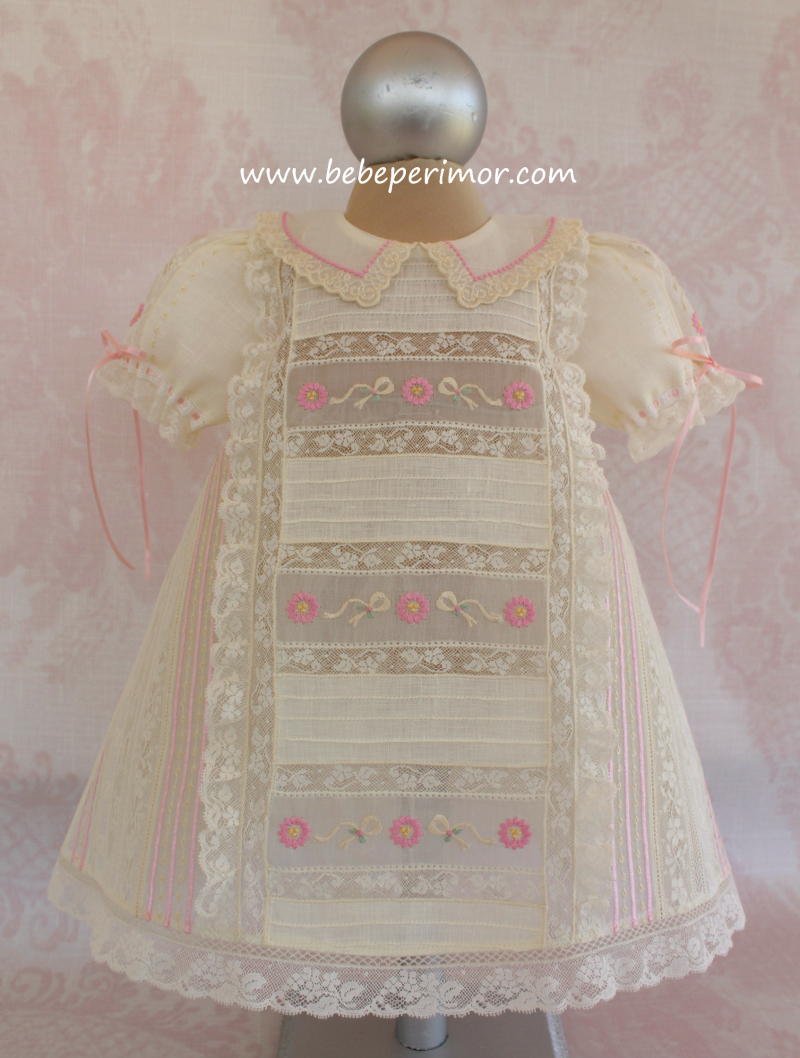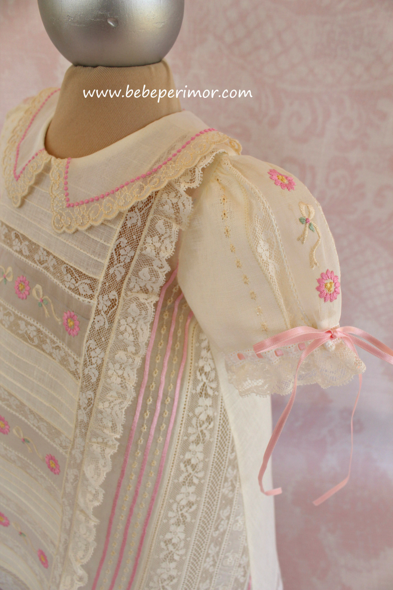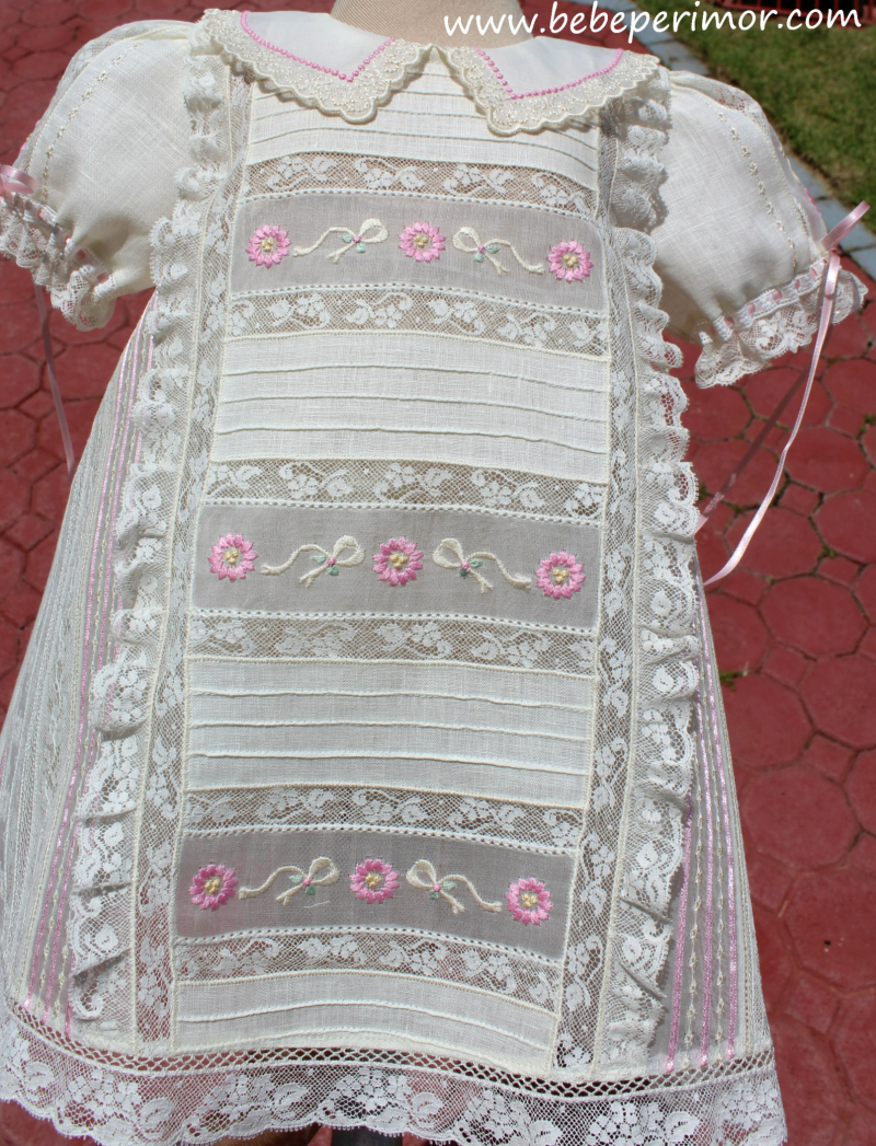 Para cualquier ocasión especial éste hermoso juego bordado de dos piezas vestidito y ballerinas en estopilla crema ,puntillas en valencien,organdy suizo y cintas de satín.