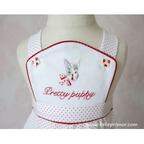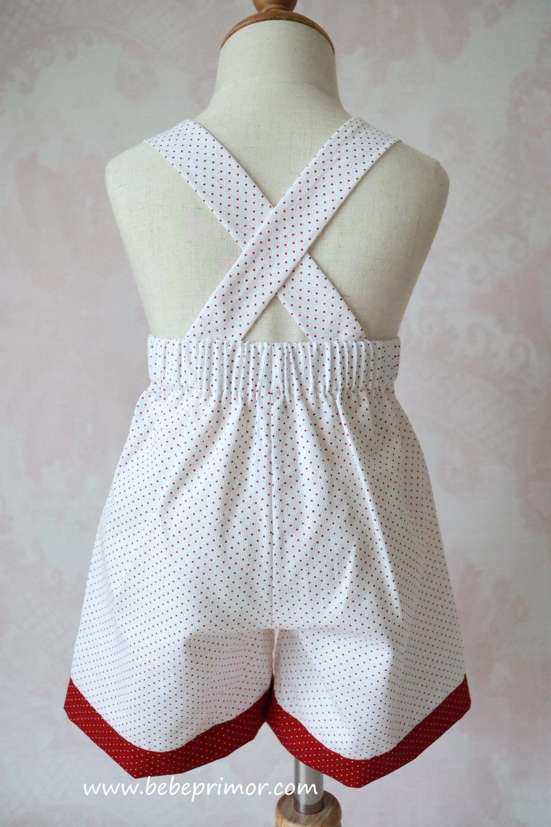 Presentamos nuestros elegante peto en pique suizo de puntos rojo y blanco. Este peto corto presenta en la pechera un adorable perrito ,los tirantes cruzados que abrochan con botones cuadrados en madre perla le dan un toque divertido a este diseño clásico.