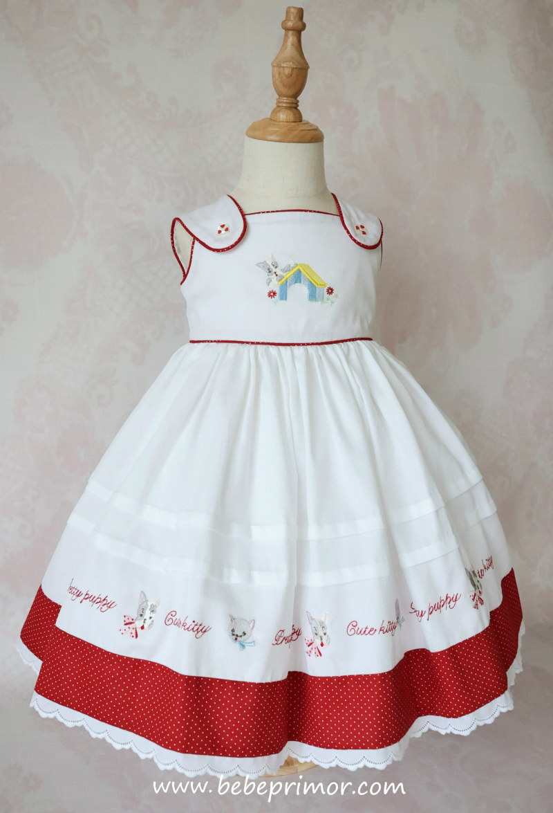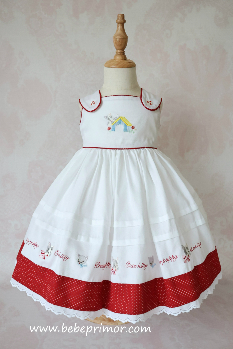 Una adición versátil al guardarropa de tu niña. Hermoso vestido confeccionado en un suave piqué finito suizo ,tiras bordadas suiza ,bordados en la falda y en el frente con adorables perritos y gaticos,abrocha con botones de nácar en la espalda y al frente.