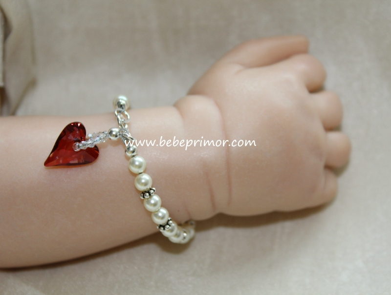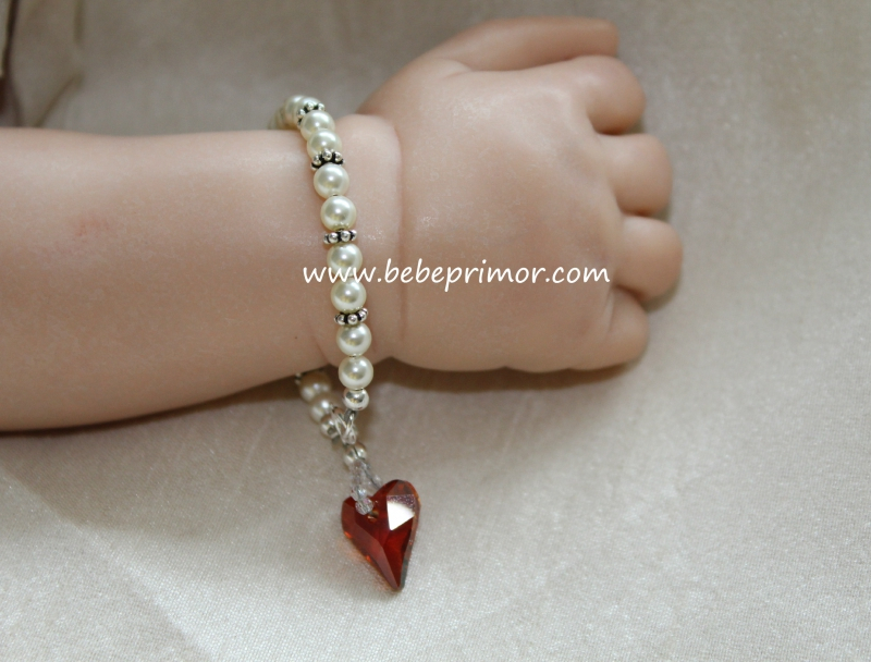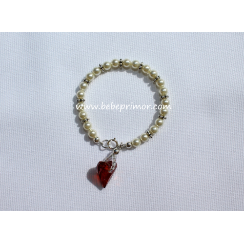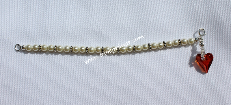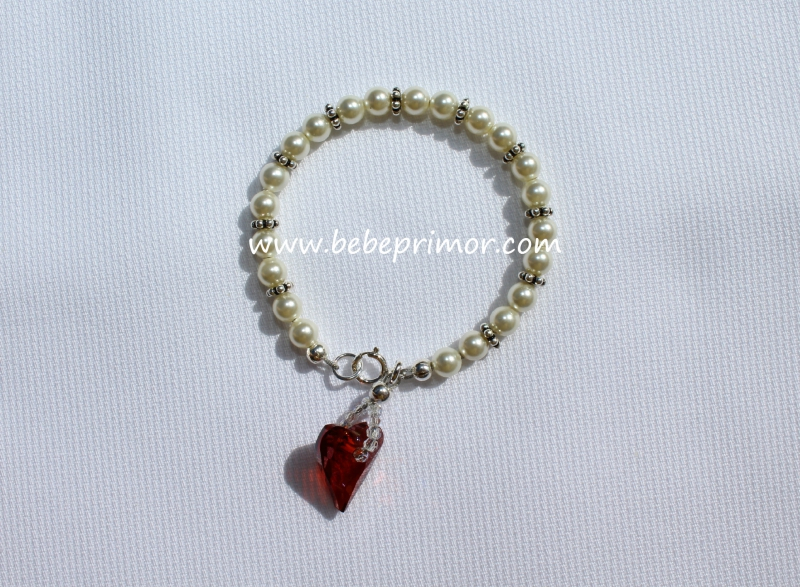 Pulserita en swarovski color ivory con detalles en plata y un corazón rojo ,el largo es de 4 1/4" pulgadas,perfecta para combinar con cualquier vestidito en estopilla.