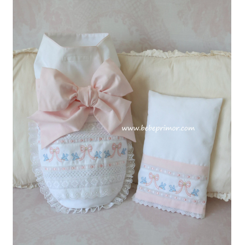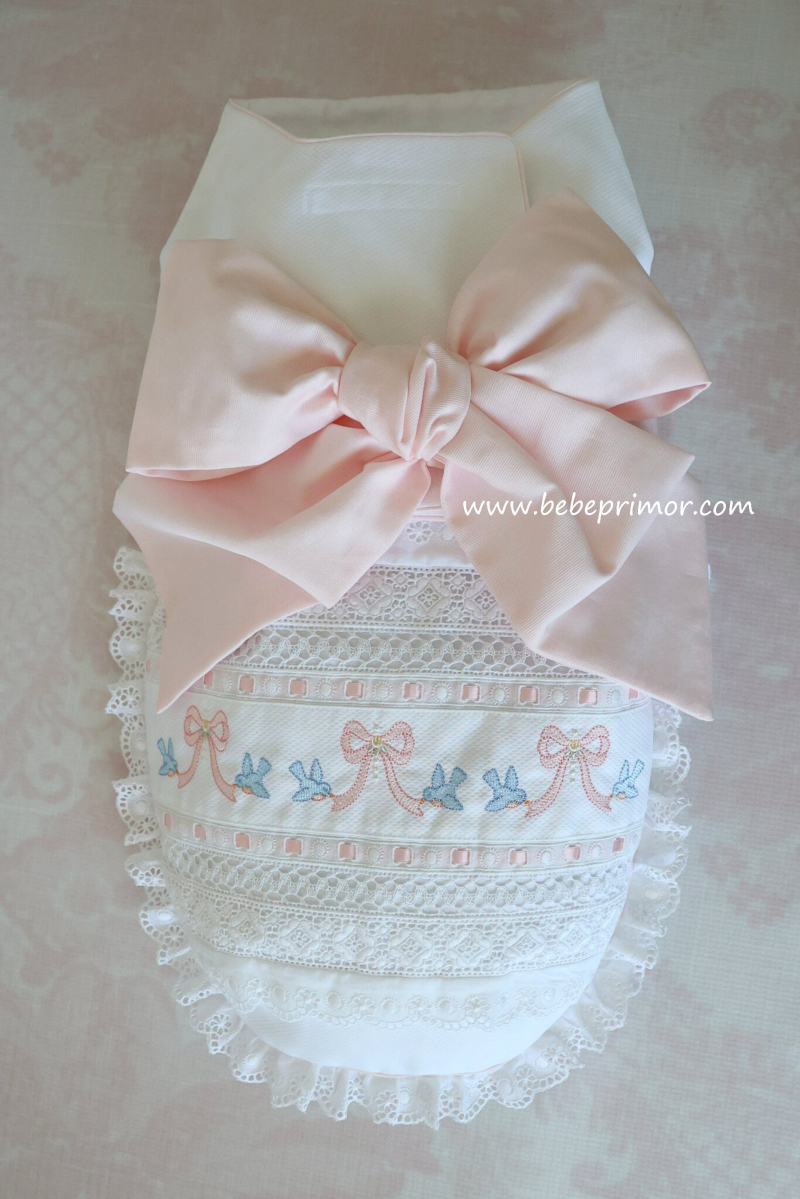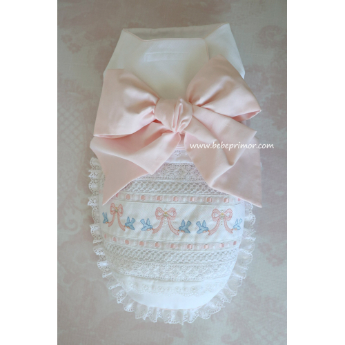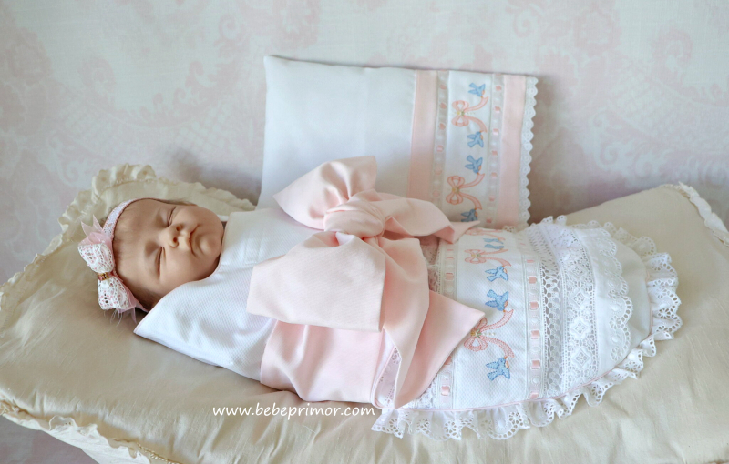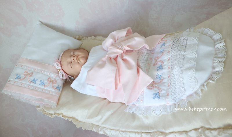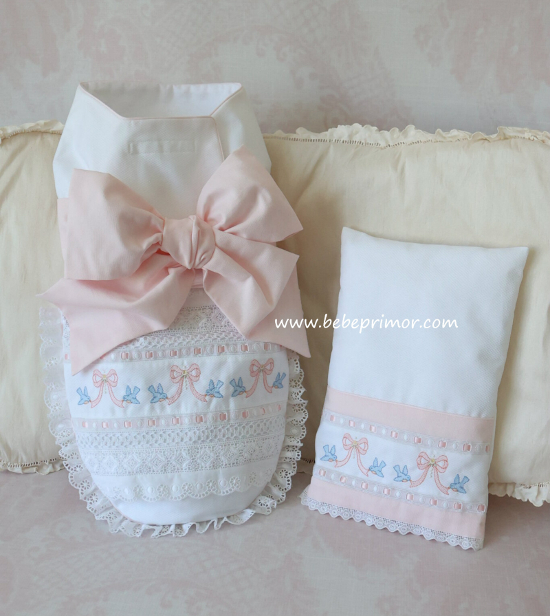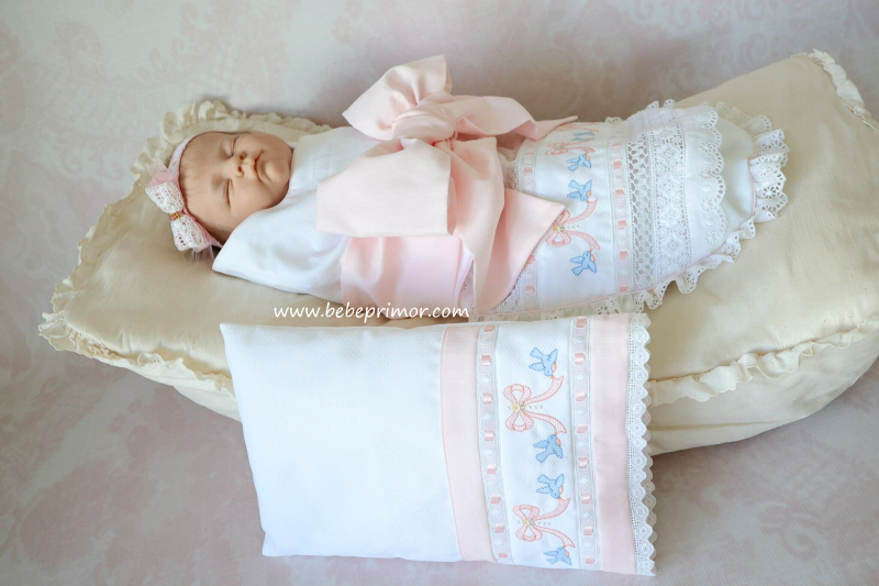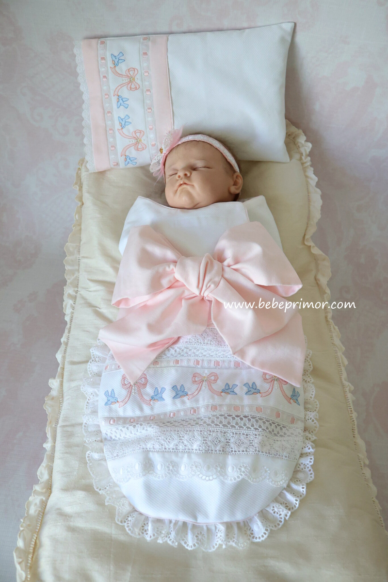 "Swaddle baby" para asemejarse al seno materno y ayudar a tranquilizar al bebé a juego con almohadita, confeccionada en piqué "Swiss bird's eye" puntas suizas y españolas, cintas en satín, forrado con franela suiza y bordados con delicadas palomitas y lazos.