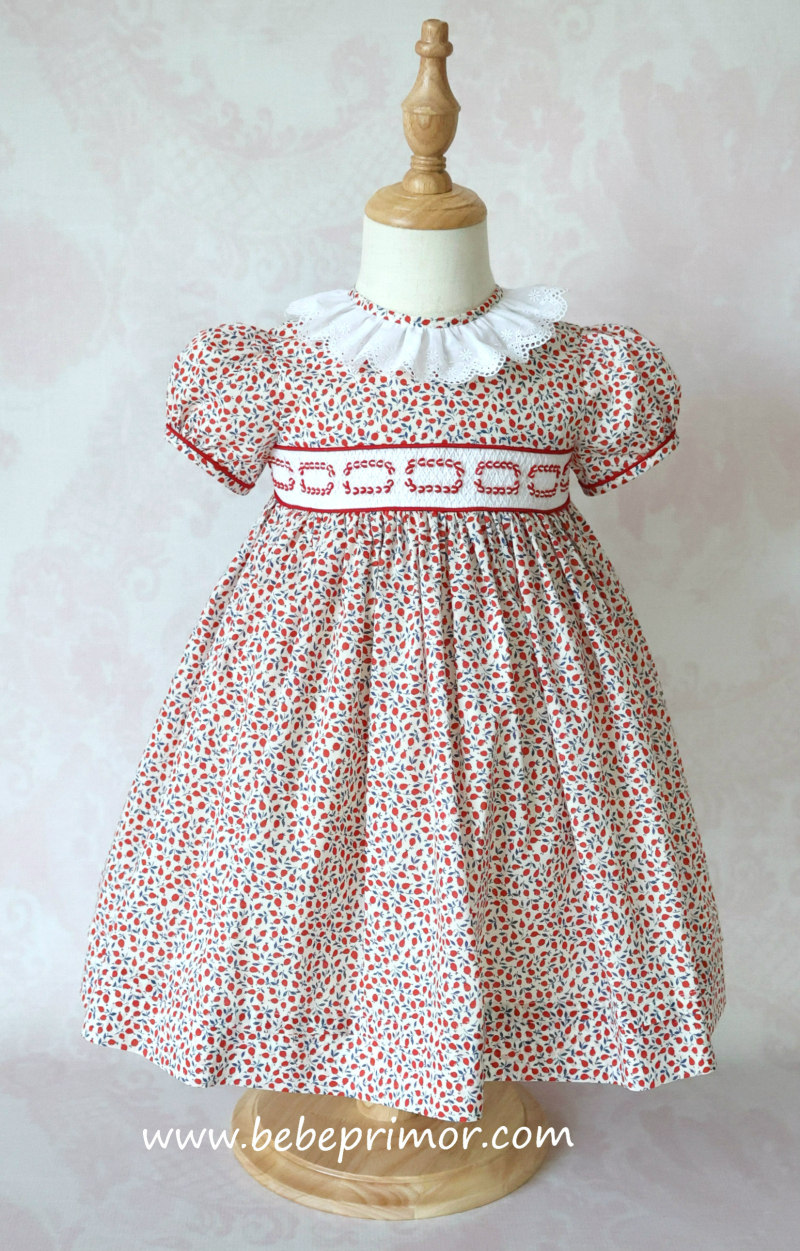 ¡Elegancia instantánea! Confeccionada con una hermosa tela Liberty, esta pieza mantendrá a tu niña elegante y cómoda al mismo tiempo. Simplista pero refinado, este vestido presenta volante en el cuello ,tiras bordadas suiza y botones en madre perlas.El fruncido o panal bordado a mano de la cintura en nelona suiza se suma a esta silueta relajada,perfecto para cumpleaños o una ocación especial.