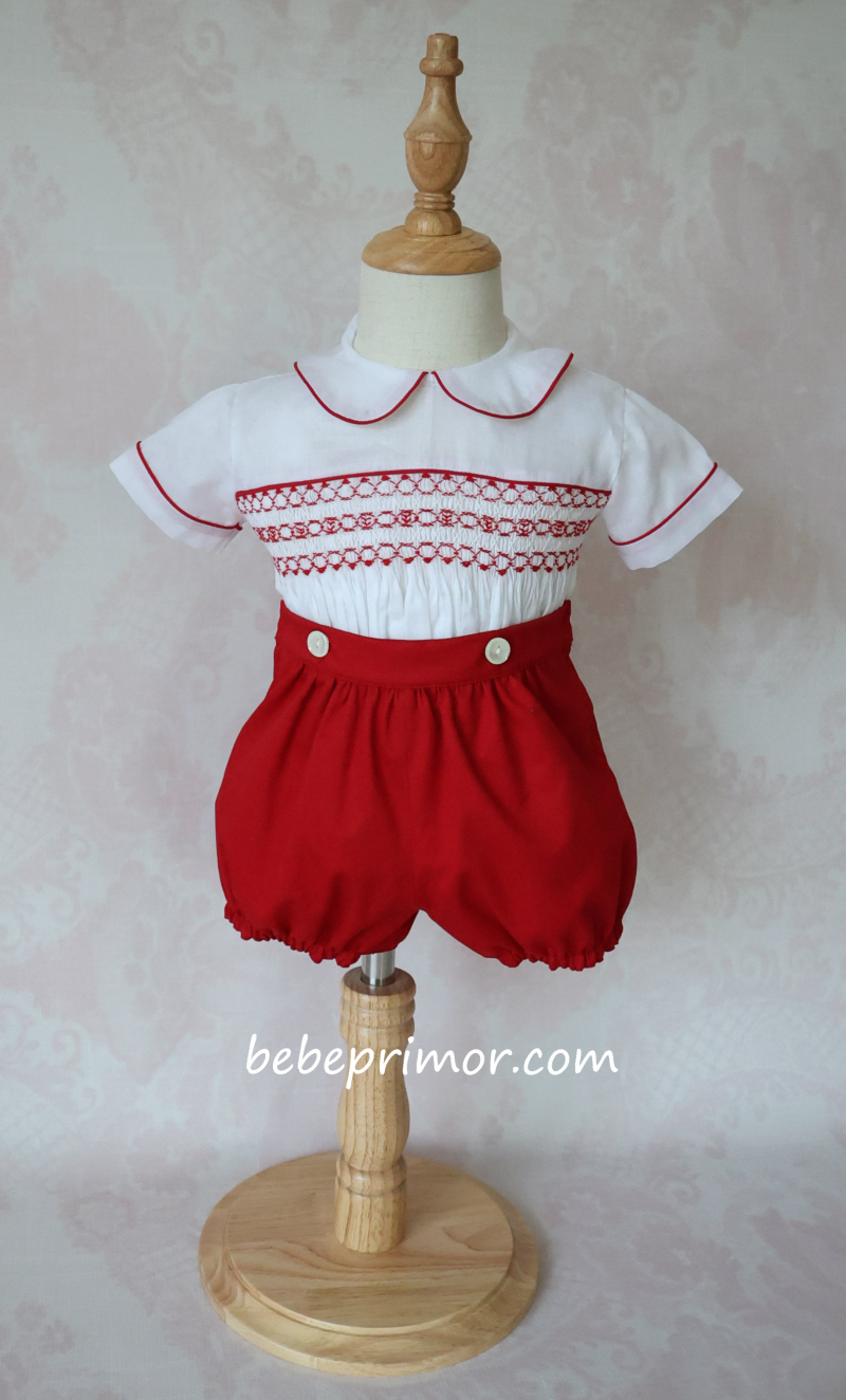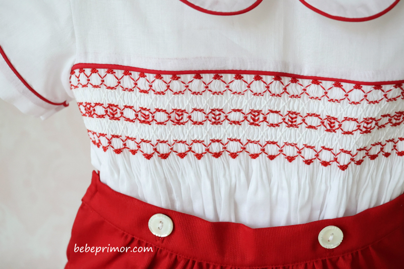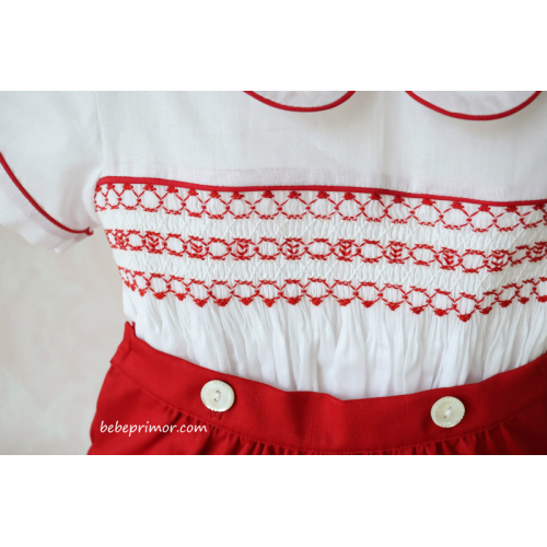 ¡Nuestro juego Antonio presenta un aspecto elegante y con estilo! Confeccionado en suave nelona suiza de algodón blanco con ribetes rojos en contraste en las mangas, el cuello y la parte delantera, con bordado fruncido a mano en el pecho con un diseño de inspiración vintage. Esta pieza se abrocha con delicados botones de nácar en la faja del short y detrás de la camisa, lo que agrega un toque especial para mantener a tu pequeño con estilo y cómodo ,va combinado con short en piqué suizo rojo.