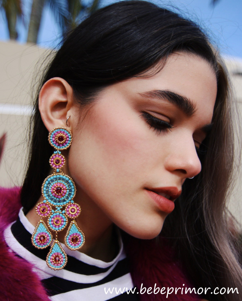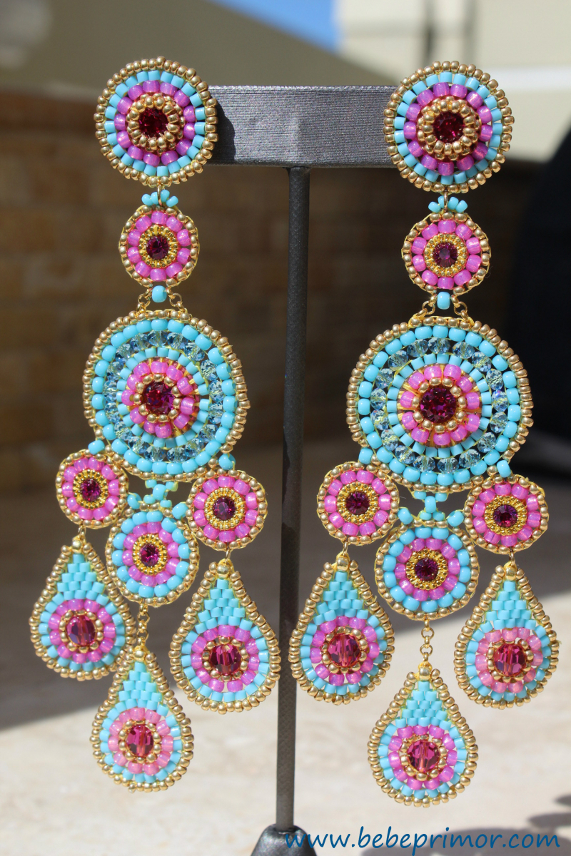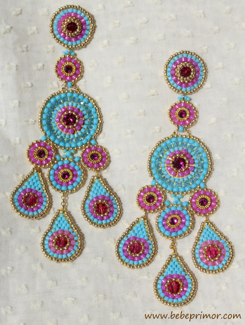 Aretes hermoso con cuentas por todas partes,trio de colgante de lágrimas suspendidos con medallones redondos,éstos pendientes hechos a mano,cuentas miyuki,14K gold filled y cristales swarovski,en tonos azul turquesa y magenta ,largo aproximadamente 10,5 cm ,ancho 4,2cmm