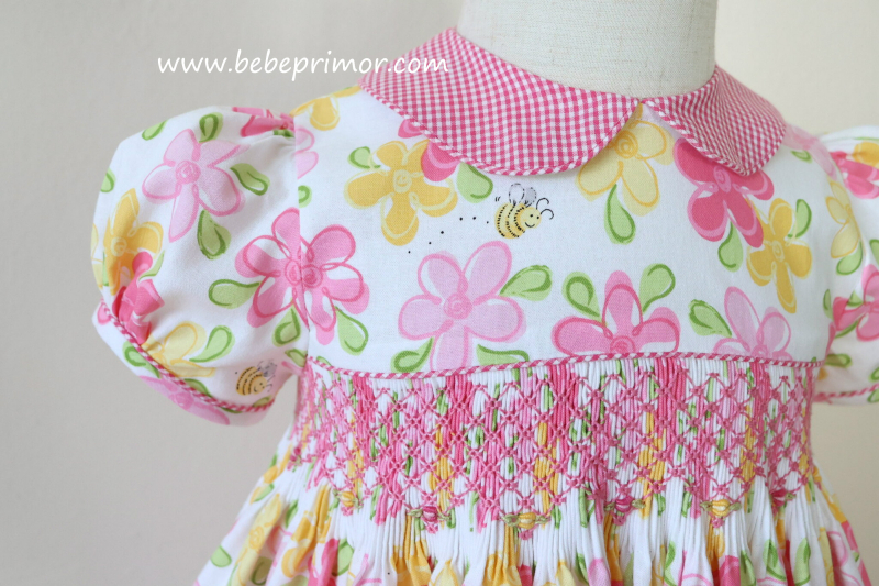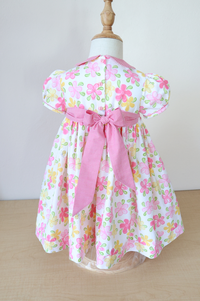 Presentamos el vestido floral rosa, un ejemplo exquisito de nuestro estilo característico de Bebé Primor. Confeccionado con nuestra tela 100% algodón,este vestido presenta un exquisito fruncido hecho a mano con capullos en rosa bordados en la parte delantera,caprichoso cuello Piter Pan y mangas abullonadas, el vestido seguramente creará un look deslumbrante para tu pequeña.
