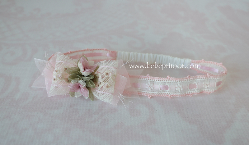 Diadema crema y rosita en pasacinta con detalles tejidos en crochet,perlas Miyuki cosidas a mano.