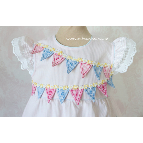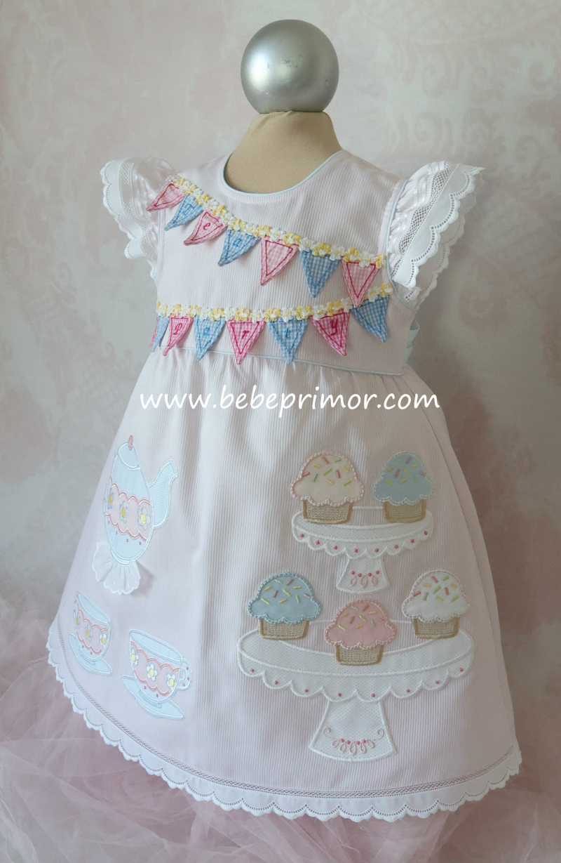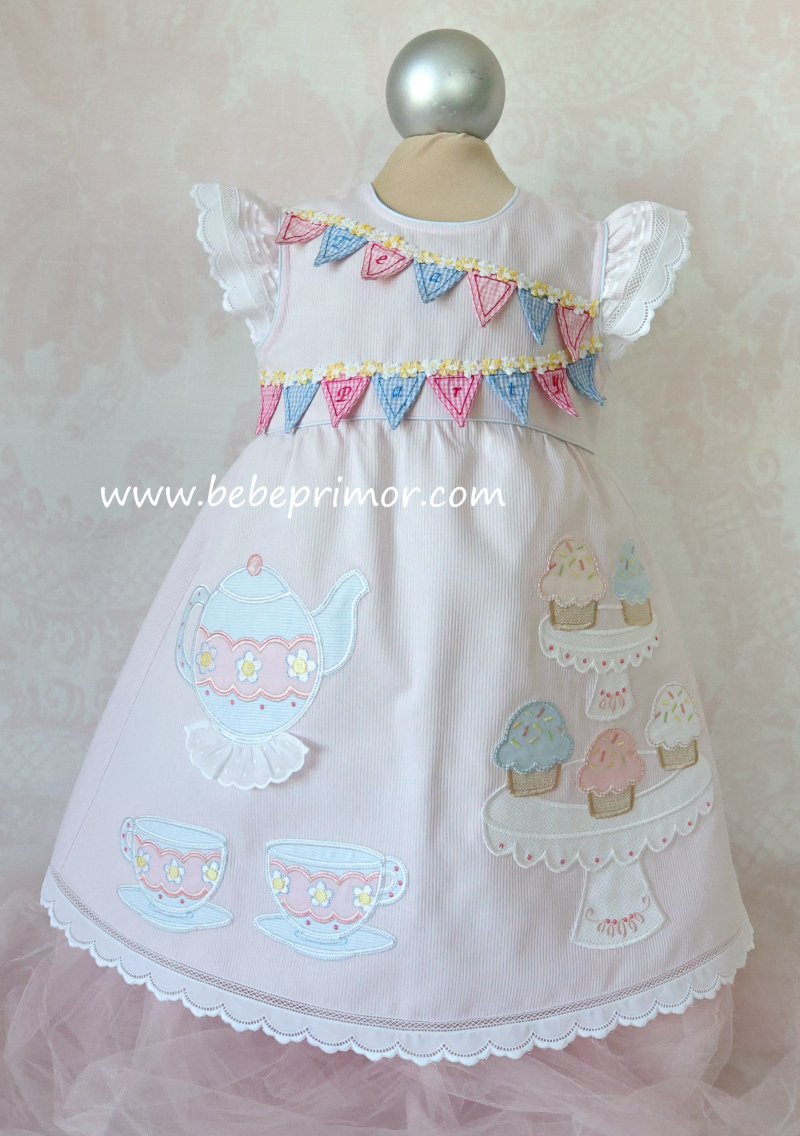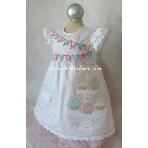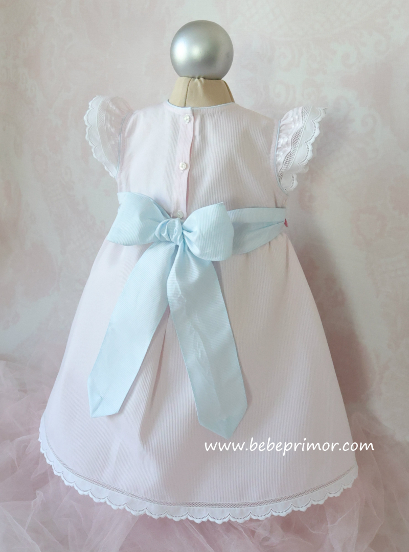 Hermoso vestido de "Fiesta de Té" confeccionado con tiras bordadas suiza,piqué 100% algodón con acabado satinado, raya sombreada color rosa bebé y botones en madre perlas.