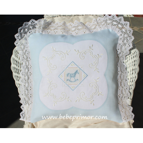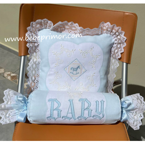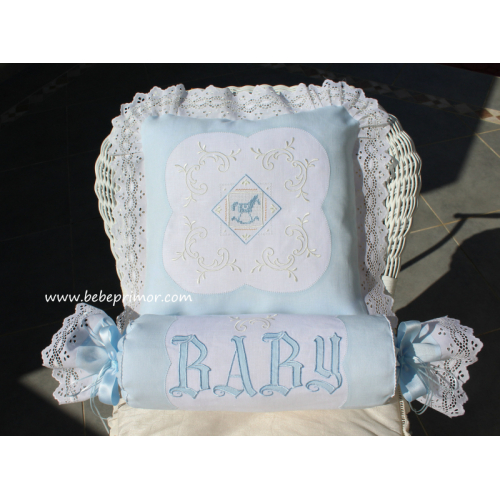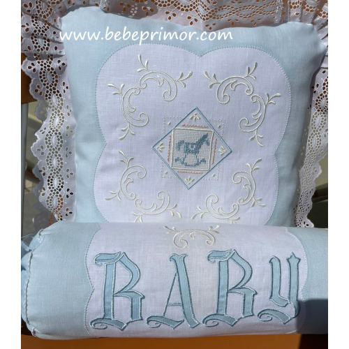 Hermoso juego de almuhadones para él bebé,confeccionado en estopilla Irlandesa blanca y azul.