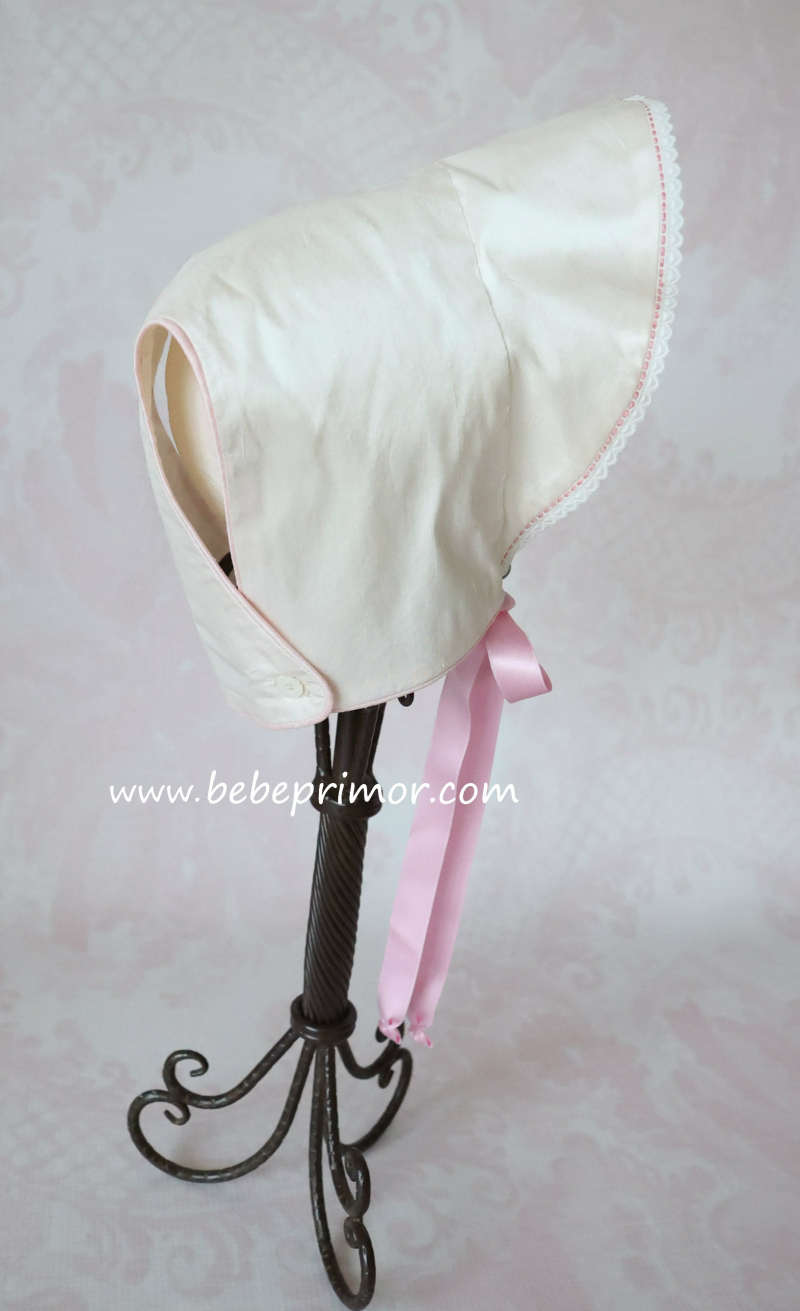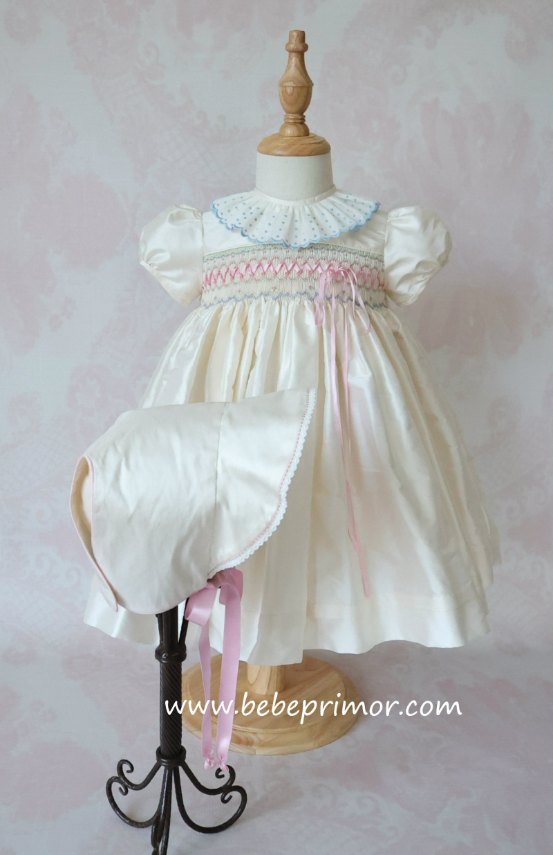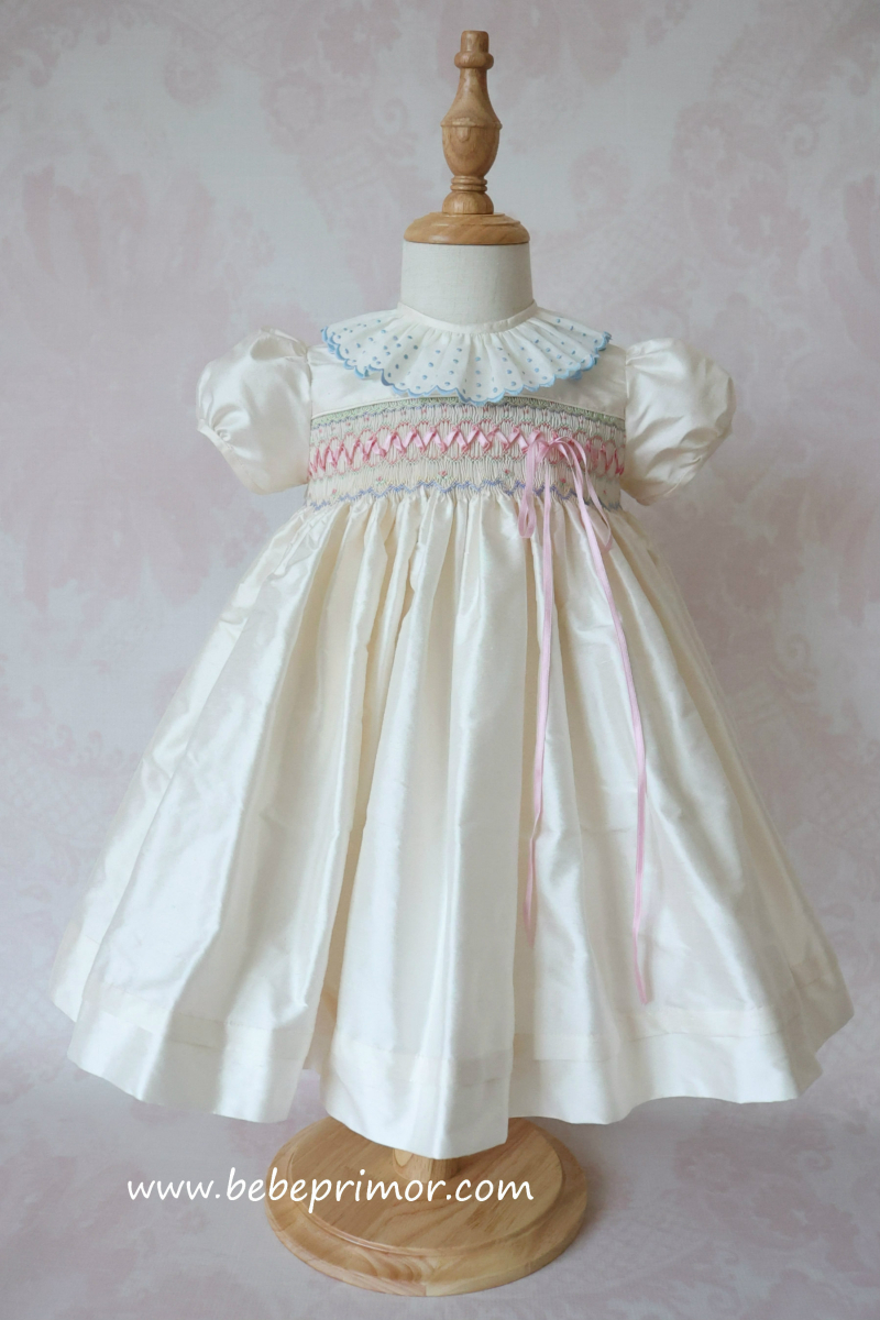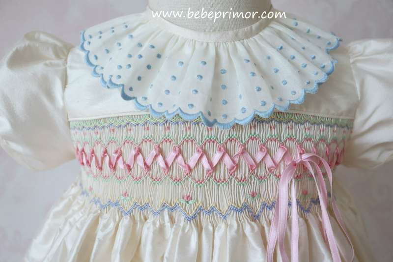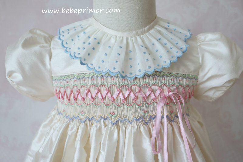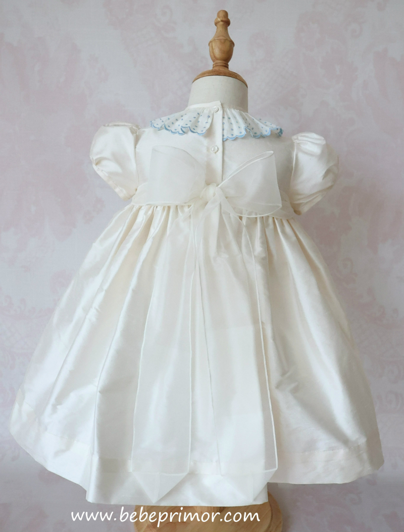 Este hermoso vestido para un dia inolvidable,presenta un exquisito frunce bordado mano estilo vintage con colores pasteles en la línea de la cintura, un hermoso cuello con volantes, se ata en la espalda con una banda en organza de seda y abrocha con delicados botones de nácar, tiene una encantadora cinta de seda entrelazada, que le da un toque femenino extra a esta silueta de lujo, va a juego con un gorrito ,confeccionado en seda cruda color marfil.