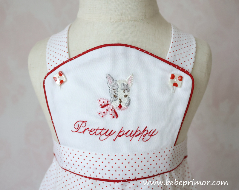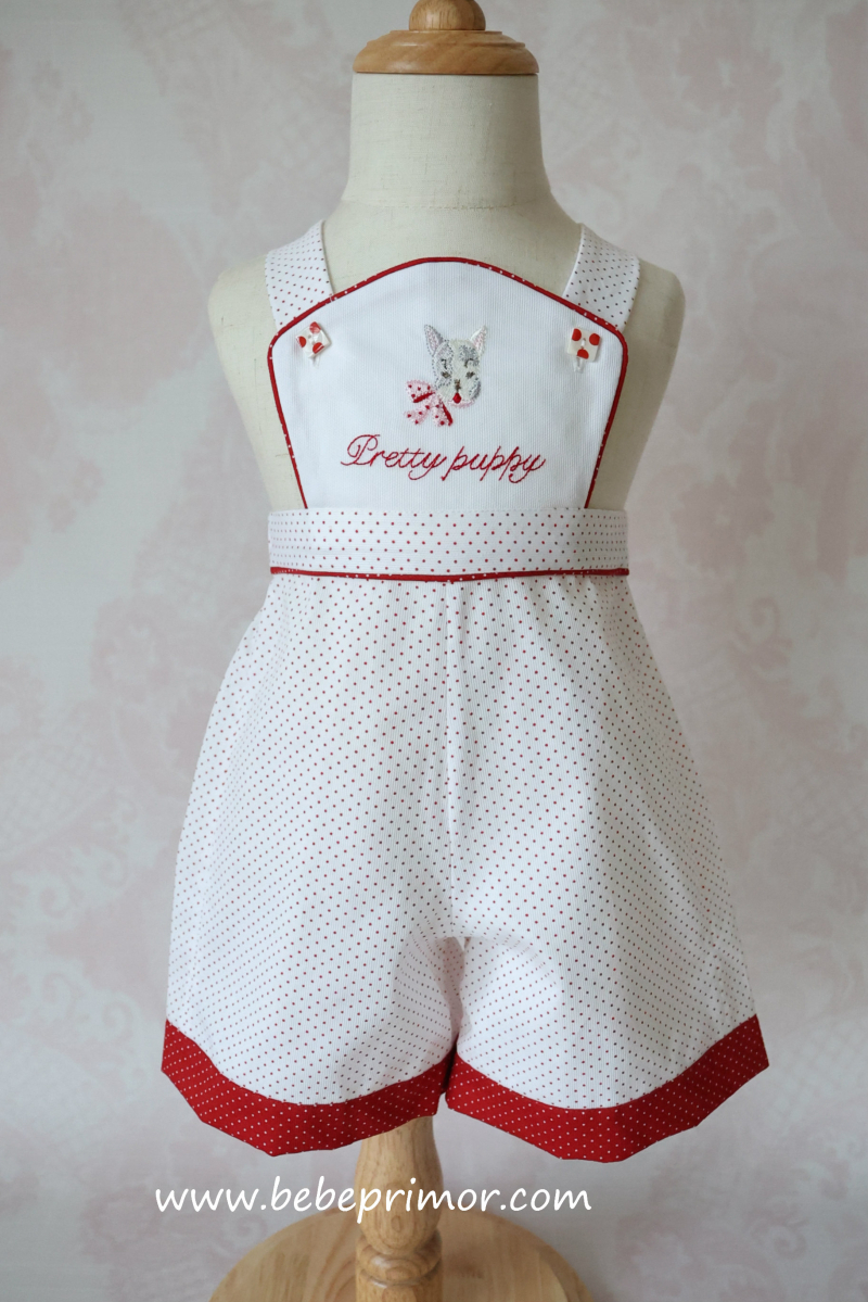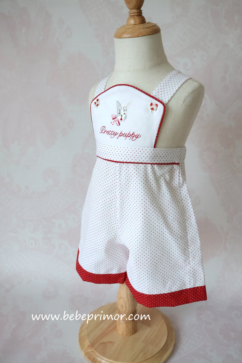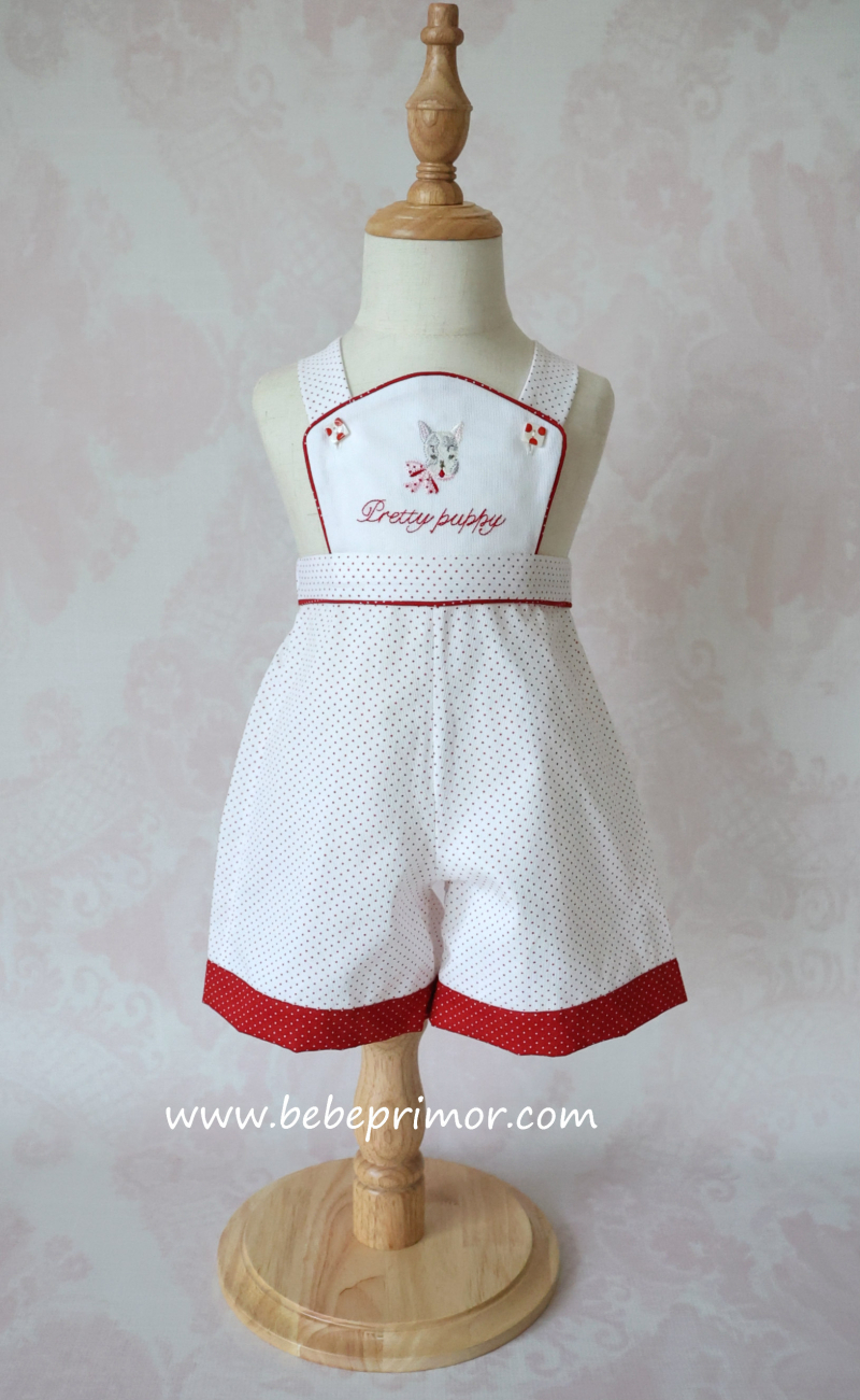 Presentamos nuestros elegante peto en pique suizo de puntos rojo y blanco. Este peto corto presenta en la pechera un adorable perrito ,los tirantes cruzados que abrochan con botones cuadrados en madre perla le dan un toque divertido a este diseño clásico.