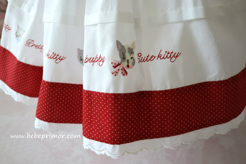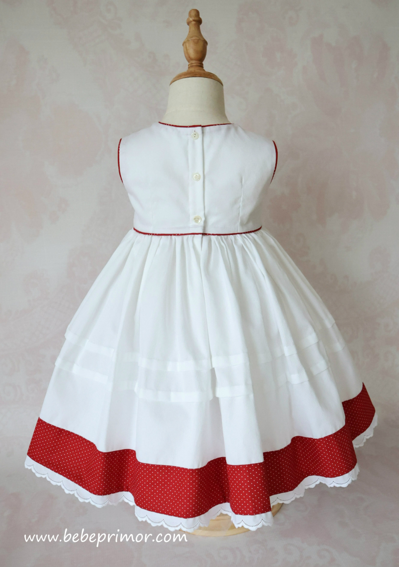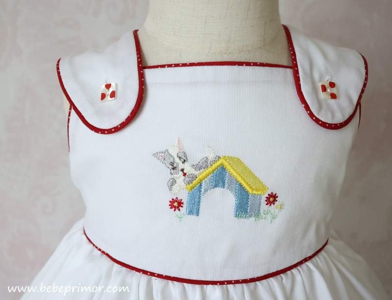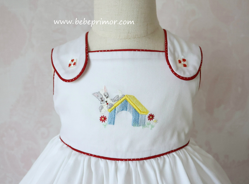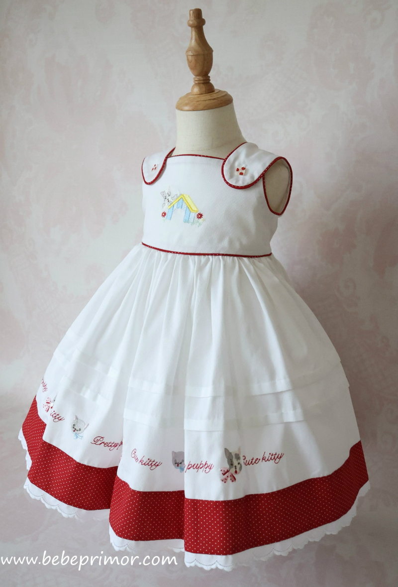 Una adición versátil al guardarropa de tu niña. Hermoso vestido confeccionado en un suave piqué finito suizo ,tiras bordadas suiza ,bordados en la falda y en el frente con adorables perritos y gaticos,abrocha con botones de nácar en la espalda y al frente.