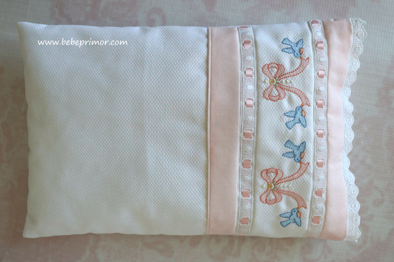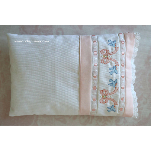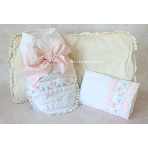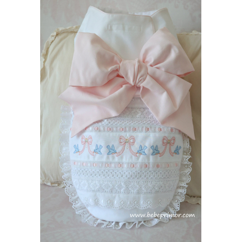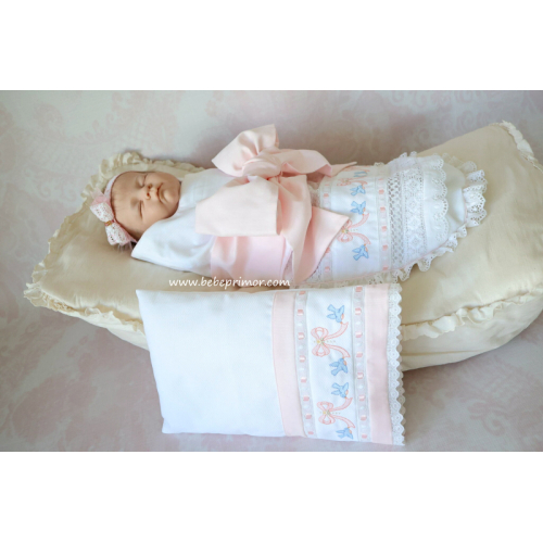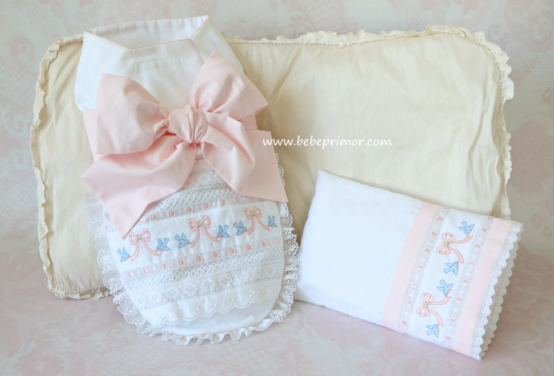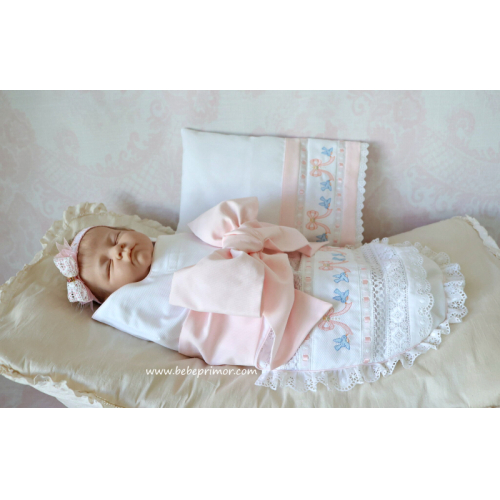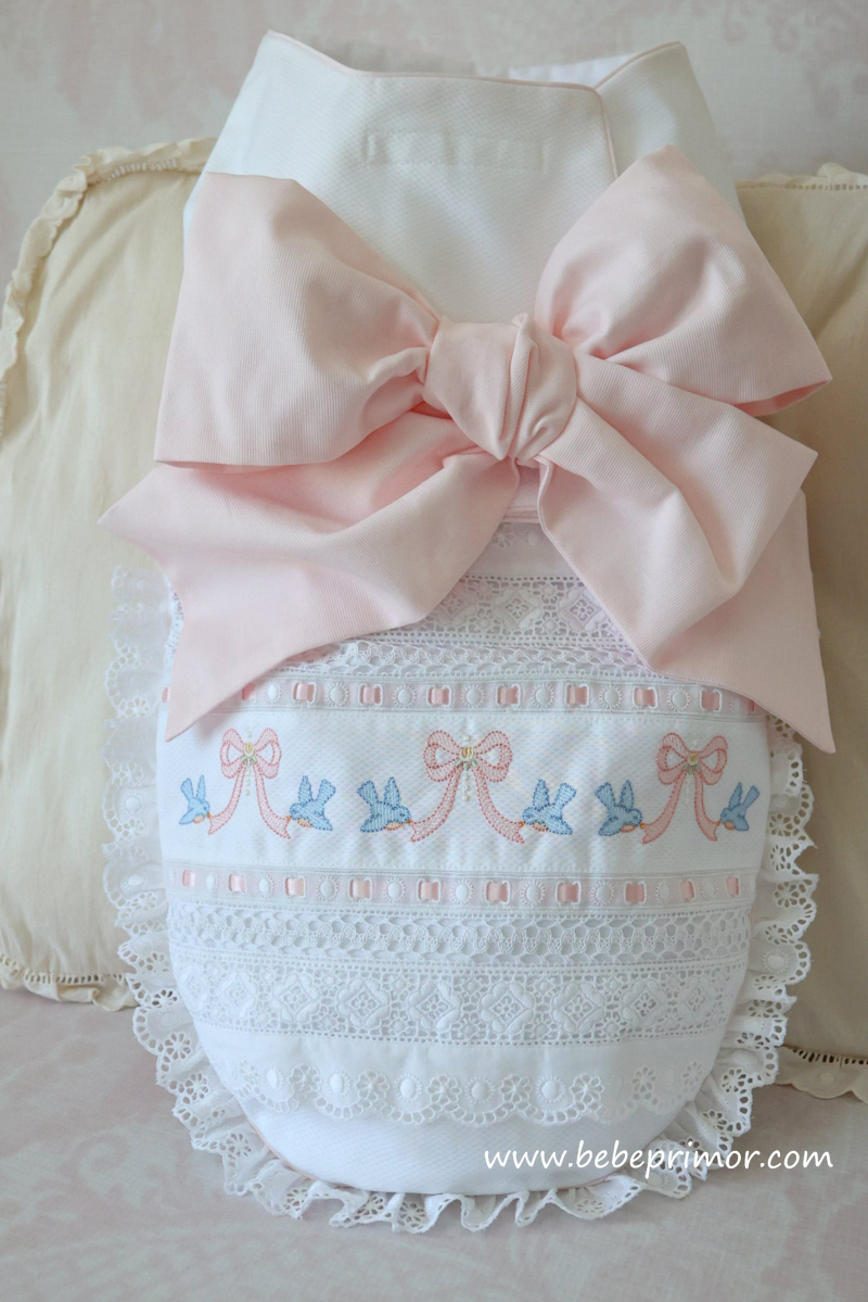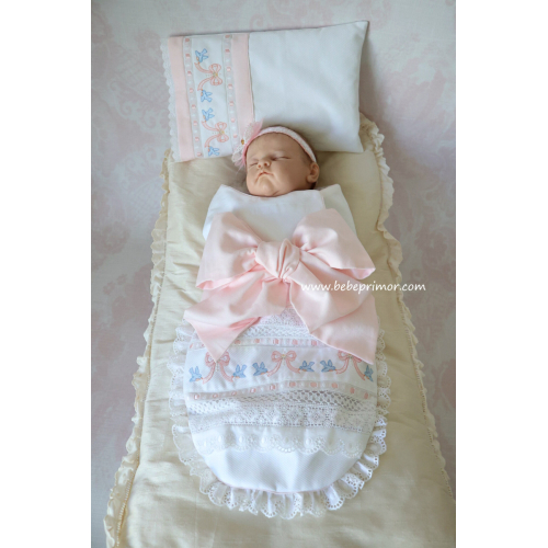 "Swaddle baby" para asemejarse al seno materno y ayudar a tranquilizar al bebé a juego con almohadita, confeccionada en piqué "Swiss bird's eye" puntas suizas y españolas, cintas en satín, forrado con franela suiza y bordados con delicadas palomitas y lazos.